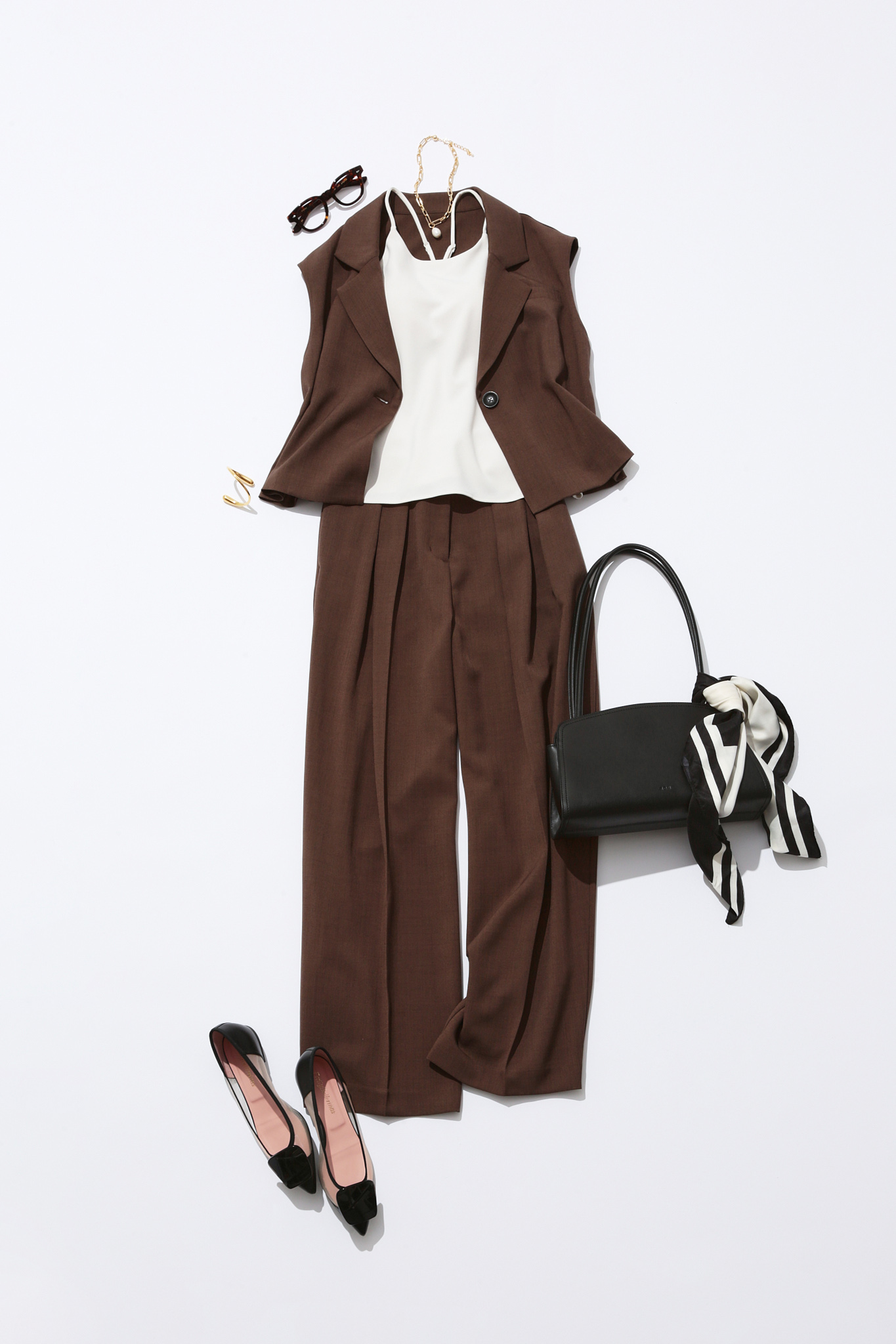 高機能キャミソールとブラウンセットアップでトレンドを押さえて