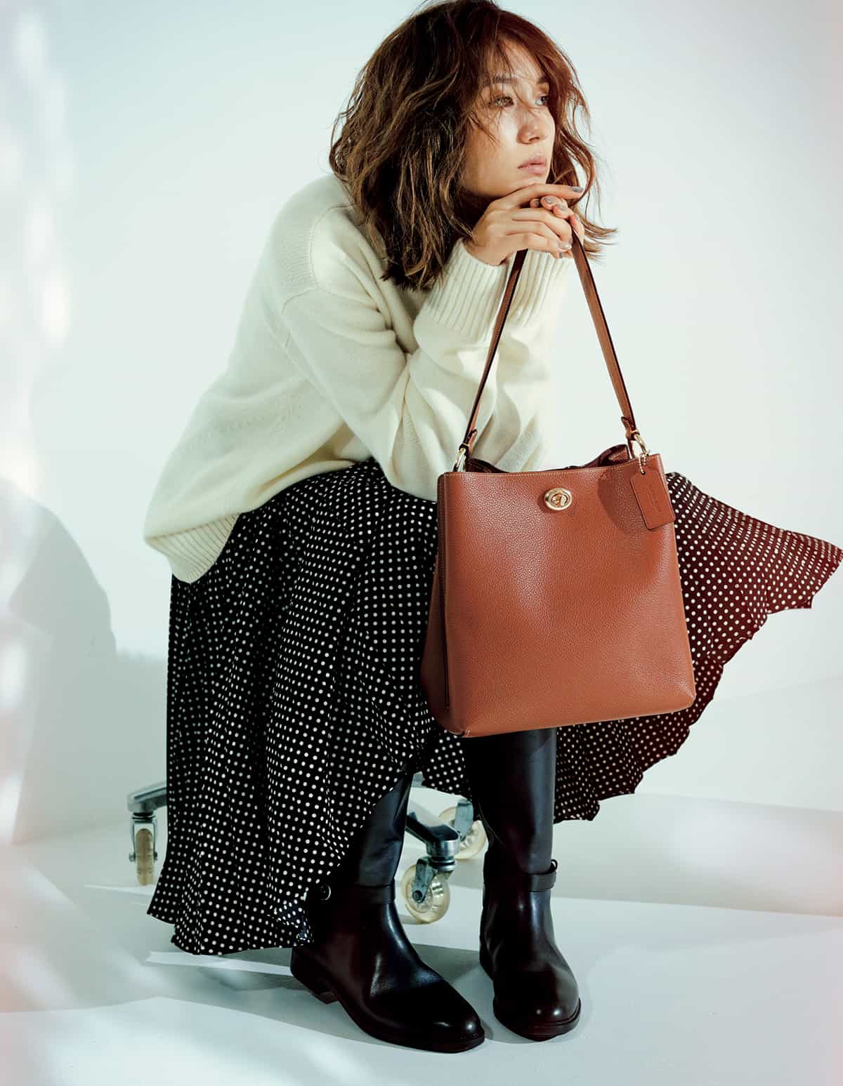 収納力とスマートさを兼ね備えた縦長フォルムと軽さが魅力の、チャーリー バケット。ふたつのコンパートメントに加え、内側には多機能ポケットがあしらわれているので、日常品をきちんと収納できます。ショルダーとしてもクロスボディとしても、ハンズフリーで使えるのもうれしい。 バッグ「Charlie バケット バッグ」〈W26.5×H27×D15.5cm〉[ショルダーストラップ付き]¥64,000ニット¥45,000スカート¥45,000ロングブーツ¥55,000(すべてコーチ/コーチ・カスタマーサービス・ジャパン)