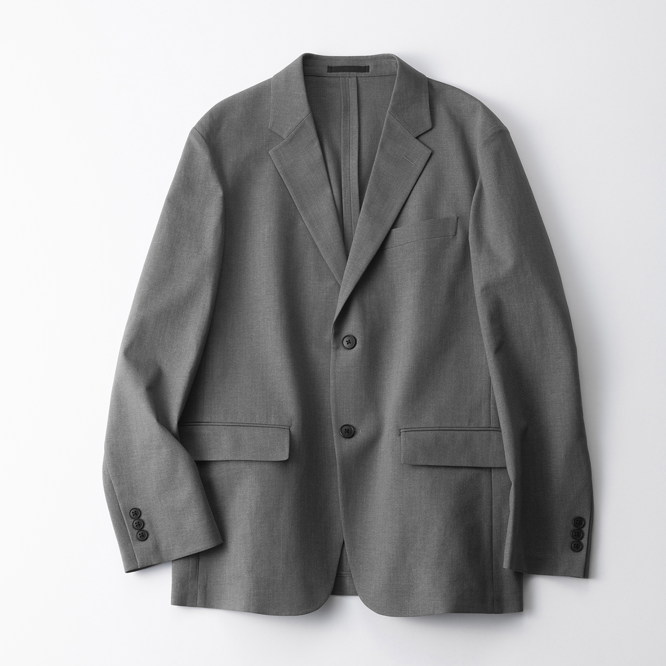 ジャケットを今どきっぽく着こなすなら「メンズライクな大きめサイズでキレイ色とも相性の良いグレー」が断然オシャレ!軽量、伸縮、速乾性という3拍子が揃った優秀素材で着心地も◎。感動ジャケット¥6,990(UNIQLO)