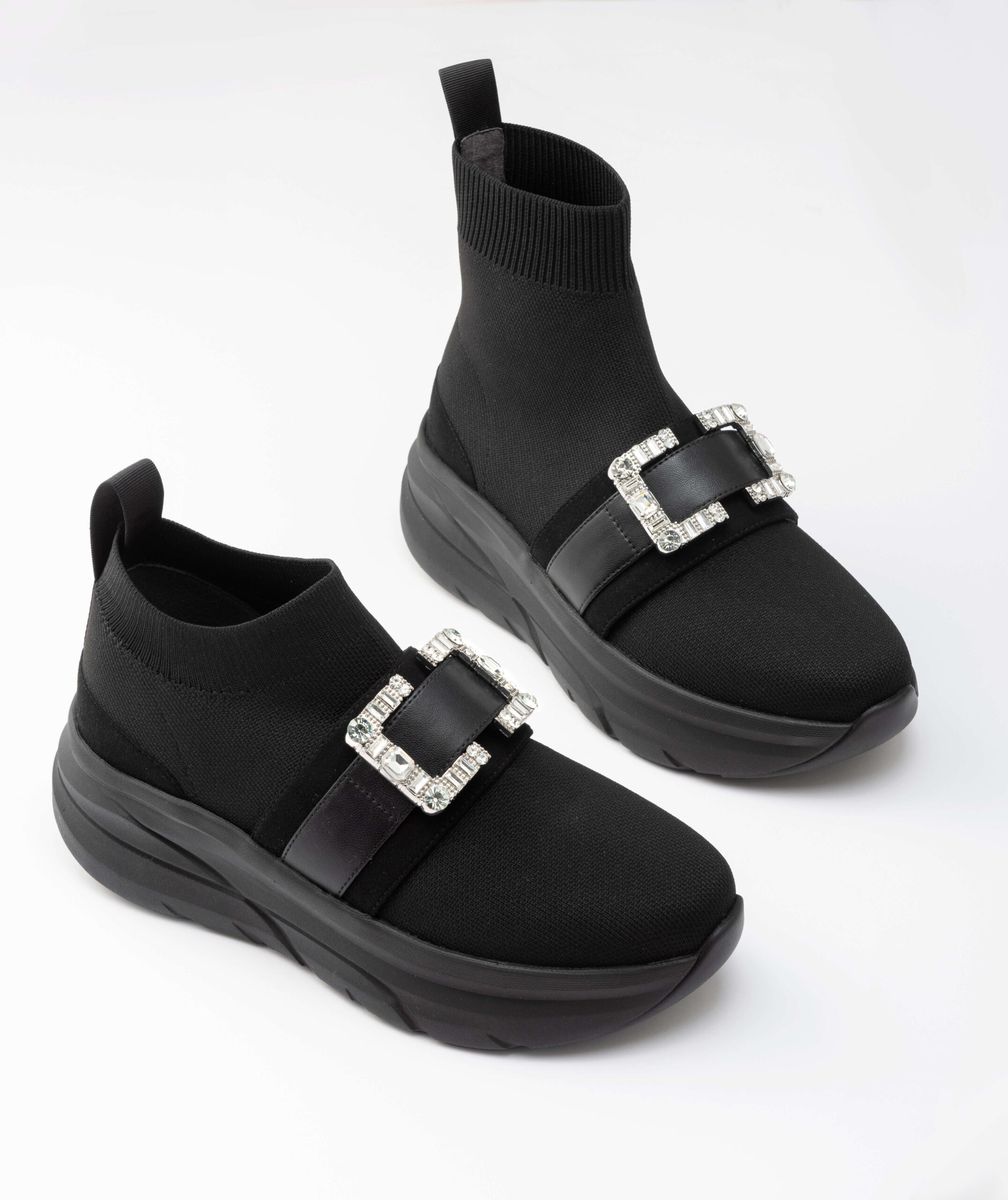 フロントのクリスタルバックルが足元にクラス感をプラス。心地よくフィットする撥水加工済みニットと軽量なボリュームソールで履き心地も◎!
