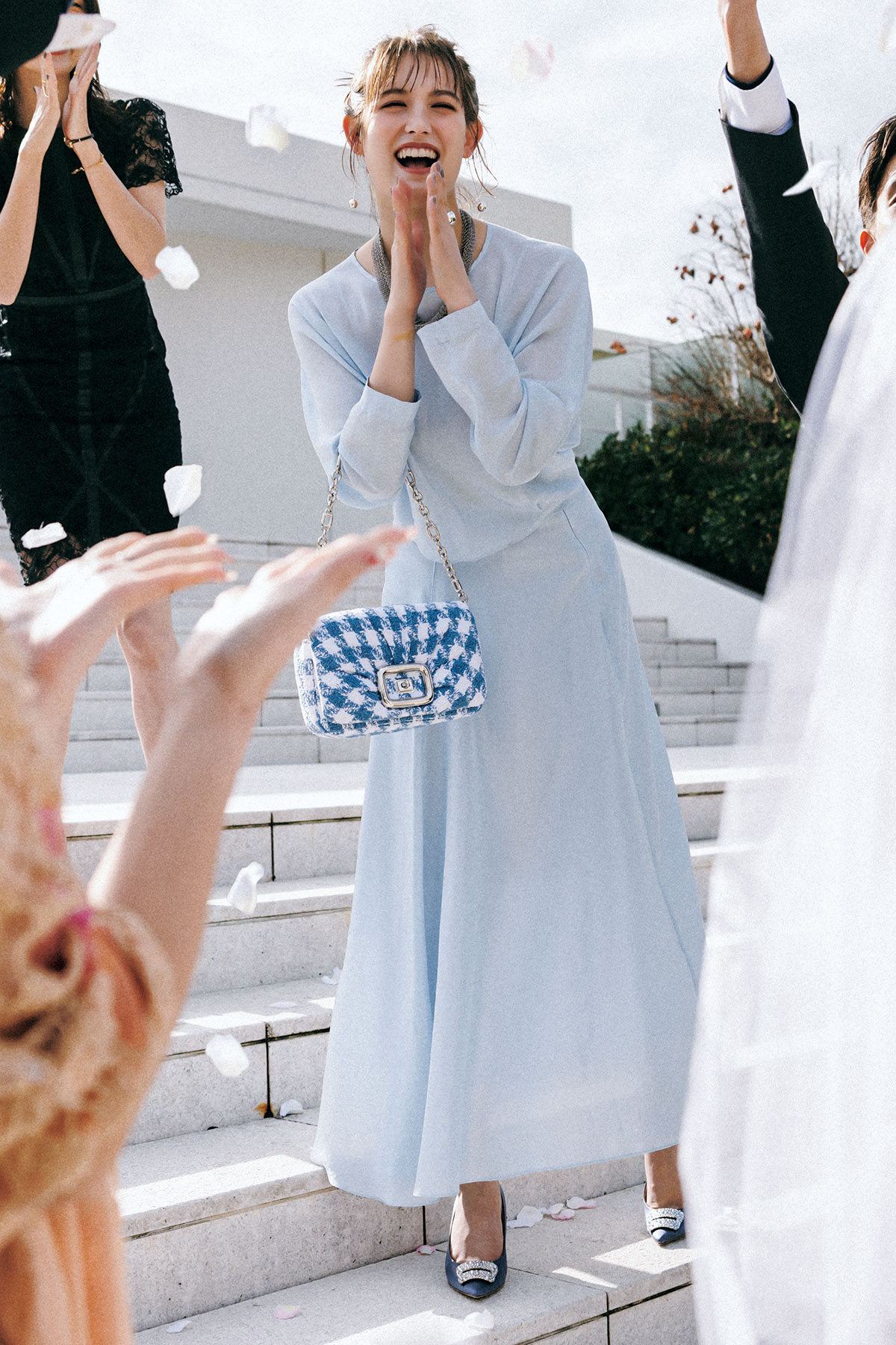 ペールブルーのトップスとスカートは、晴れやかなお呼ばれシーンにぴったり。とろみ素材の揺れ感が女性らしさを引き立てつつ、小物もブルーでまとめたスタイリングが洗練度を高めます。ビジュー付きパンプスで艶めきをプラスすれば、より特別感のあるスタイルに。