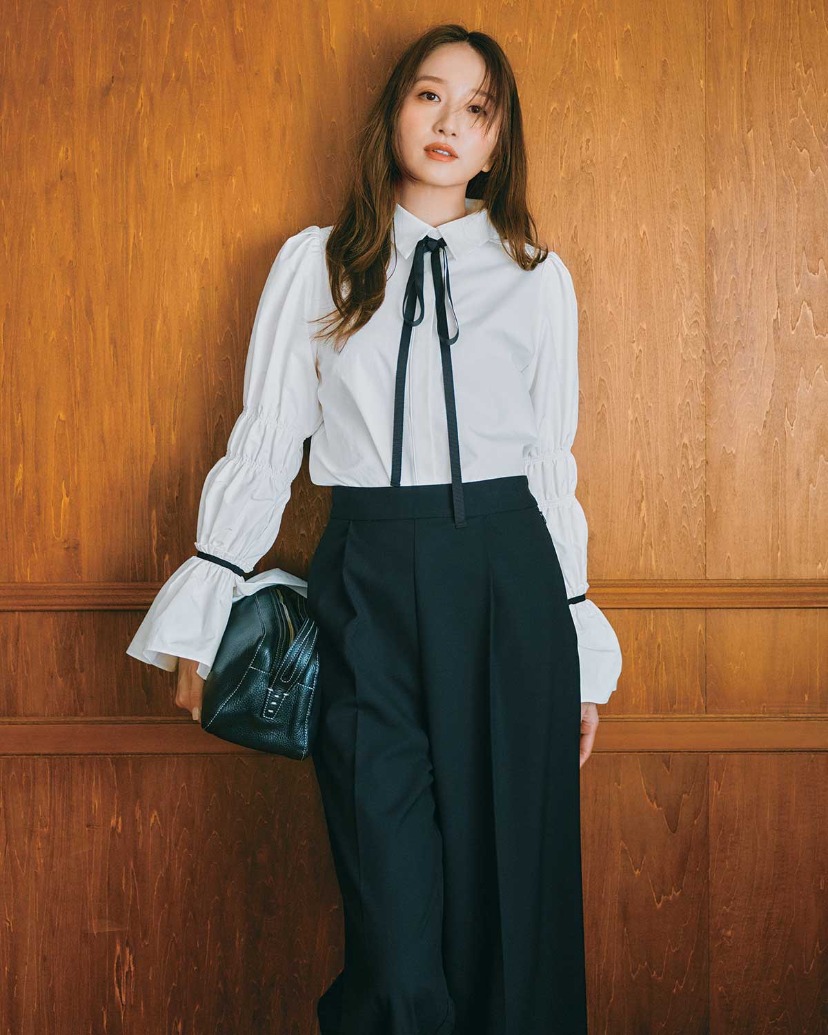 繊細なリボンディテールとボリュームスリーブが、装いにクラシカルなムードを運んでくれる白ブラウス。黒のワイドパンツを合わせれば、甘さを引き締めてスタイリッシュな印象に。きちんと見えしつつもかしこまりすぎないバランスが、大人の華やぎシーンと相性バッチリ♡