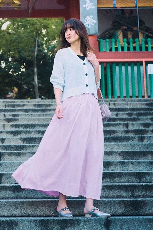 【ラベンダースカートを主役に、カーディガンで涼やかな春気分をまとう】