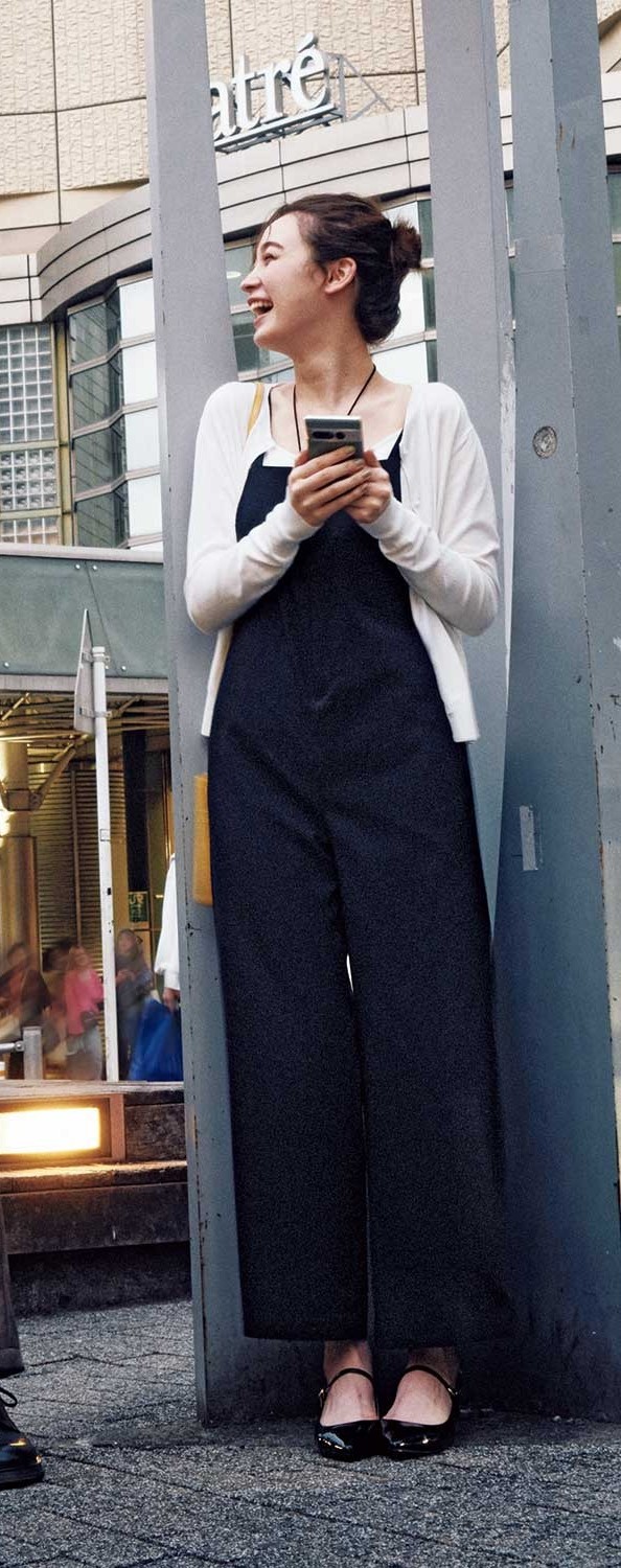【シンプルな黒のオールインワンに、白カーディガンで抜け感をプラス】
