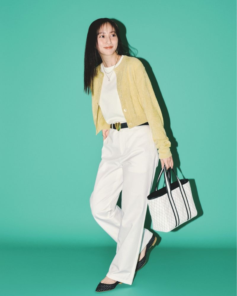 ほんのり透け感のあるサマーカーディガンが、白パンツの清潔感にやわらかなニュアンスをプラス。明るいイエローが着こなしにヘルシーな華やぎを添えてくれます。仕上げは黒小物で引き締めて、大人の余裕を感じさせる好印象コーデに。