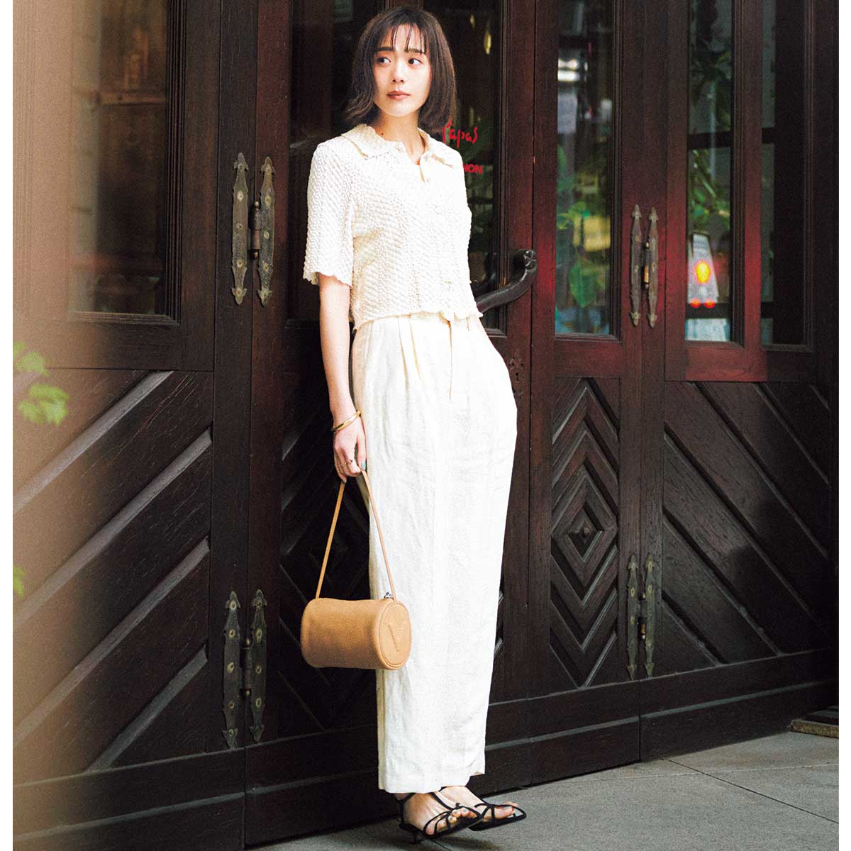 レースの甘さが映える短丈ポロに、リラクシーなリネンパンツを合わせたオフホワイトのワントーンコーデ。異素材の組み合わせが上下白に奥行きを生み、単調にならず上品な印象に。短丈トップスでさりげなくスタイルアップを狙いつつ、優しいニュアンスの色味で大人らしい柔らかさを演出して。