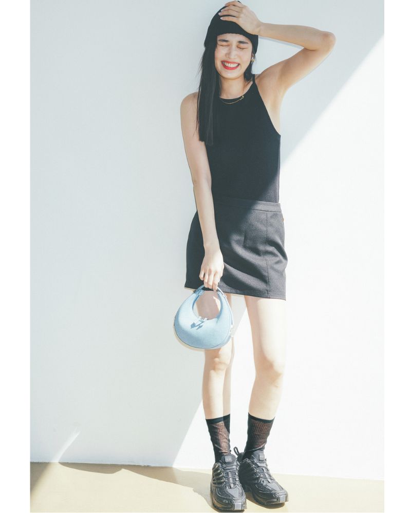 大人世代がミニ丈を取り入れるなら、ボリュームスニーカーで足元にほどよい重さを加えるのが正解。同色の靴下を合わせることでブーツ感覚で履けるので、ぐっと挑戦しやすいのがうれしいポイント。上下ブラックでまとめれば、一体感が生まれてワンピース風に見え、ミニ丈のハードルを自然に下げてくれます。