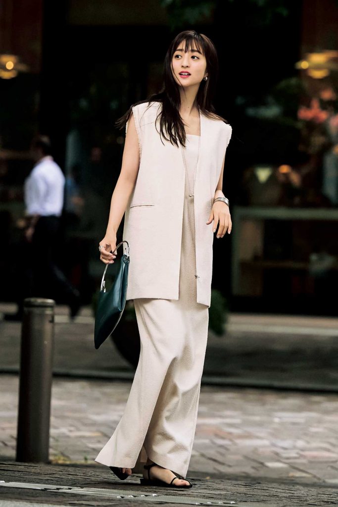 ロングジレを軸にしたベージュのワントーンコーデは、縦のラインを強調してスマートな印象に。インナーやパンツも同系色で揃えることで全身に統一感が生まれ、品の良さが際立ちます。黒のサンダルやバッグでキリリと引き締める小物ワザも◎。