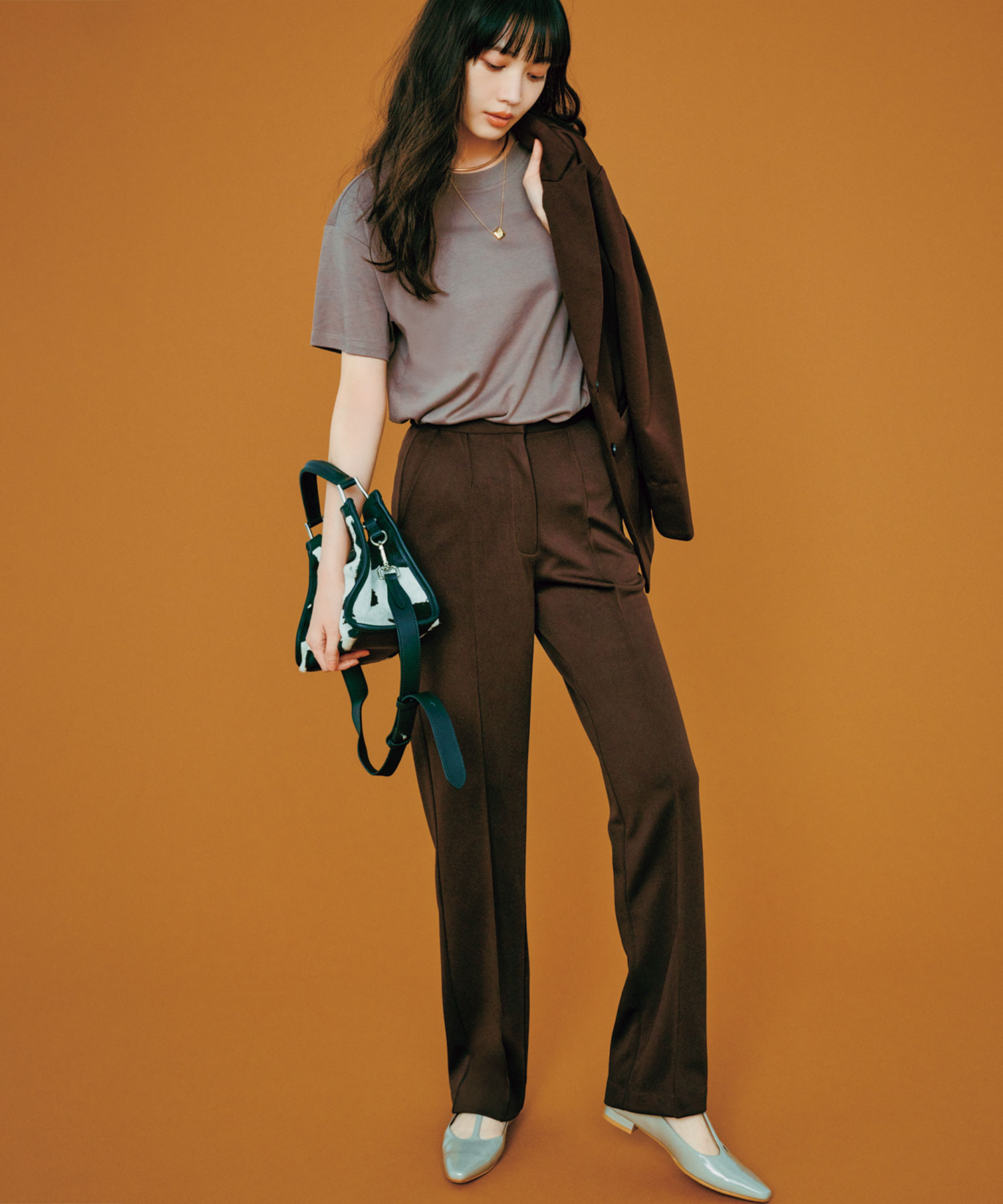 ブラックやグレーのスーツスタイルに飽きたら、今季らしいブラウンをセレクトするのも手。モカ色のTシャツを合わせて、ブラウントーンにさりげないグラデーションをつけるのが洒落感アップの秘訣です。ニュアンスカラーのパンプスで抜けをつくれば、地味とは無縁のNEWブラウンコーデが完成。