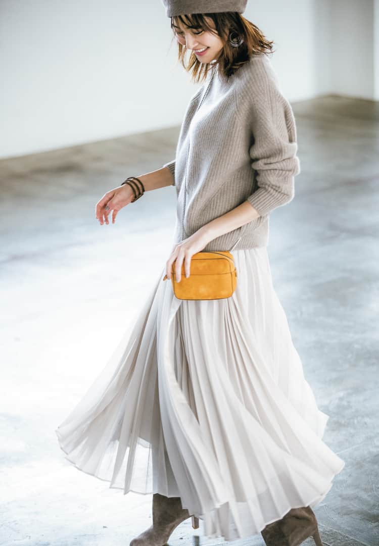 10月19日(土)、上品なグレージュニットは、優しげな雰囲気で異性ウケも間違いなし!華やかスカートに大人っぽく合わせるのが、今っぽいバランスです。