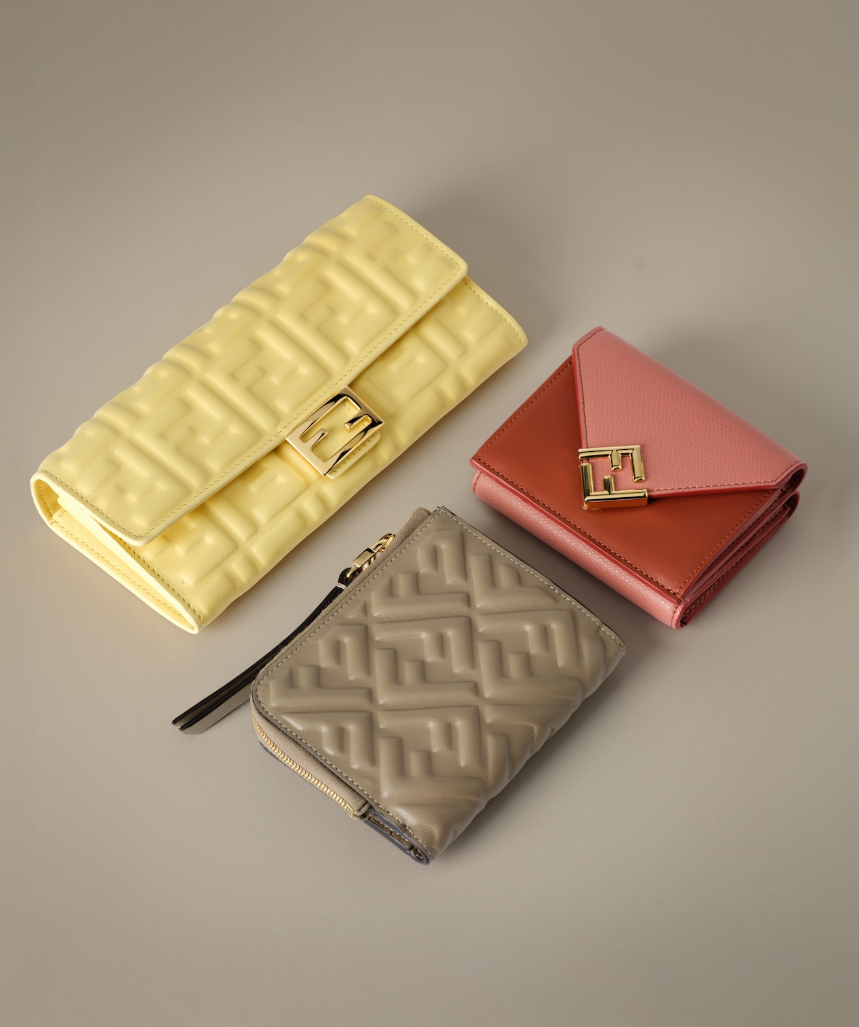 2025-26年秋冬コレクションのシーズナルカラーである華やかなソルベイエローやマカロンピンクのアイテムが新登場。「バゲット」は、スリムウォレットがリニューアルされコインケースの開口部が広がりました。手元を明るく彩るシーズナルカラーに加え、飽きのこないクラシカルなダブグレーも登場します。ダイアゴナルに配置された「FF」ロゴバックルと、メゾンを象徴するバイカラーが際立つ「FF ダイヤモンド」では、ロマンティックな濃淡のピンクが大人可愛い印象に。