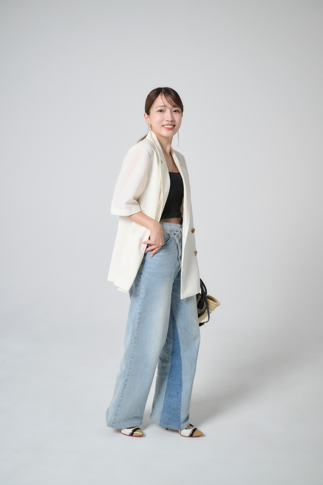 「休日はデニムと合わせてカジュアルダウンして着ることが多いです。リーダーズの間でも話題のキノ ザ ケイのデニムは、内側が濃色になっているデザインで遊び心があります。インナーも短丈にして、肌見せするとちょうどいい抜け感に」