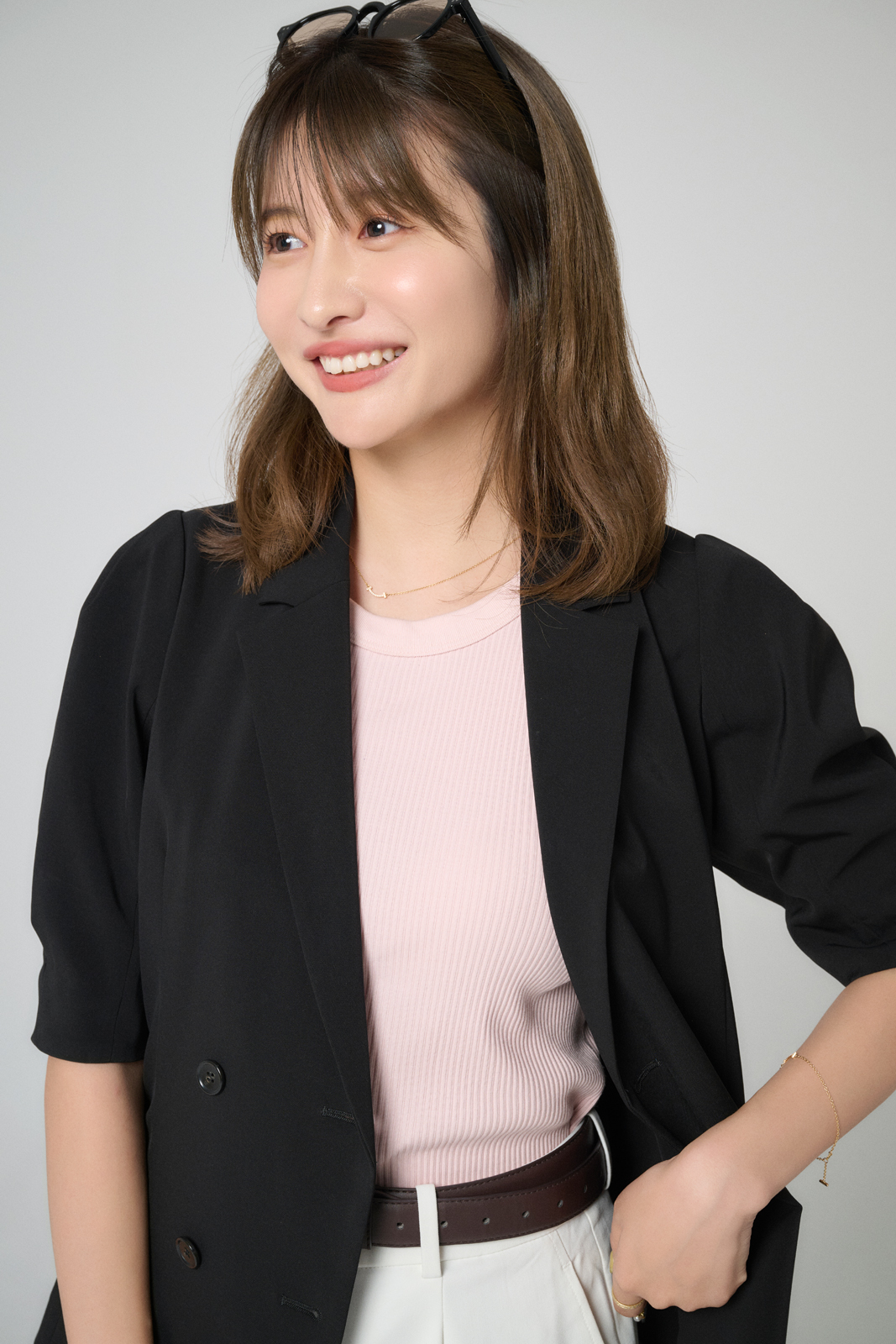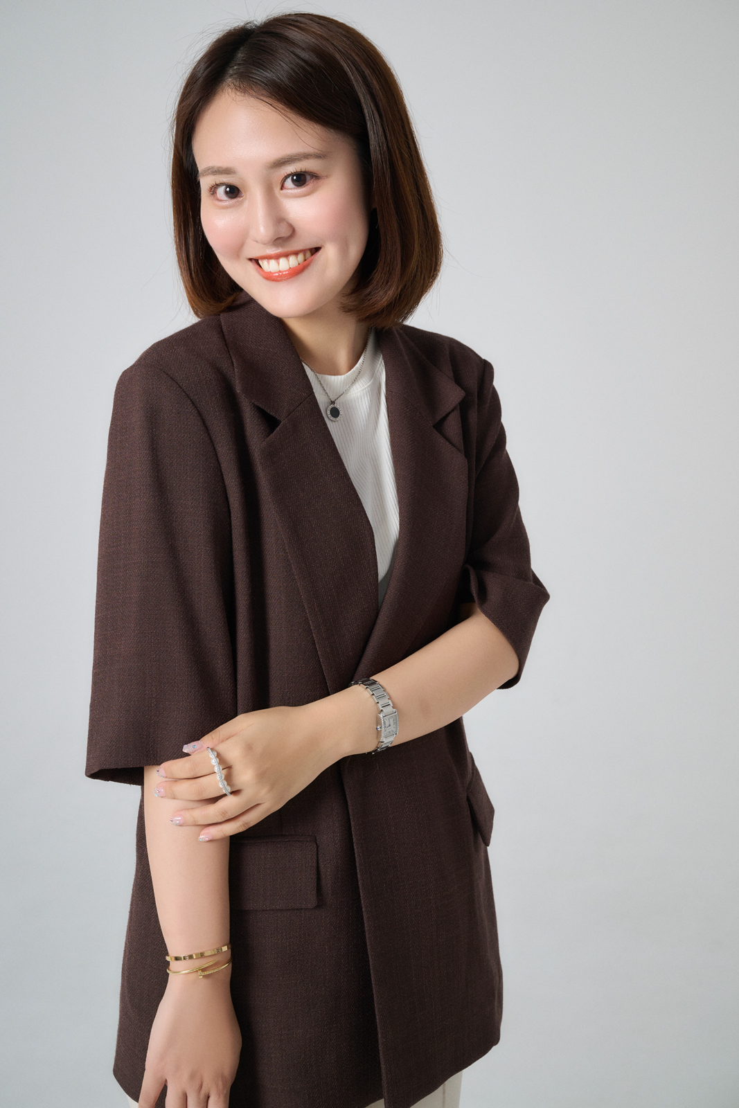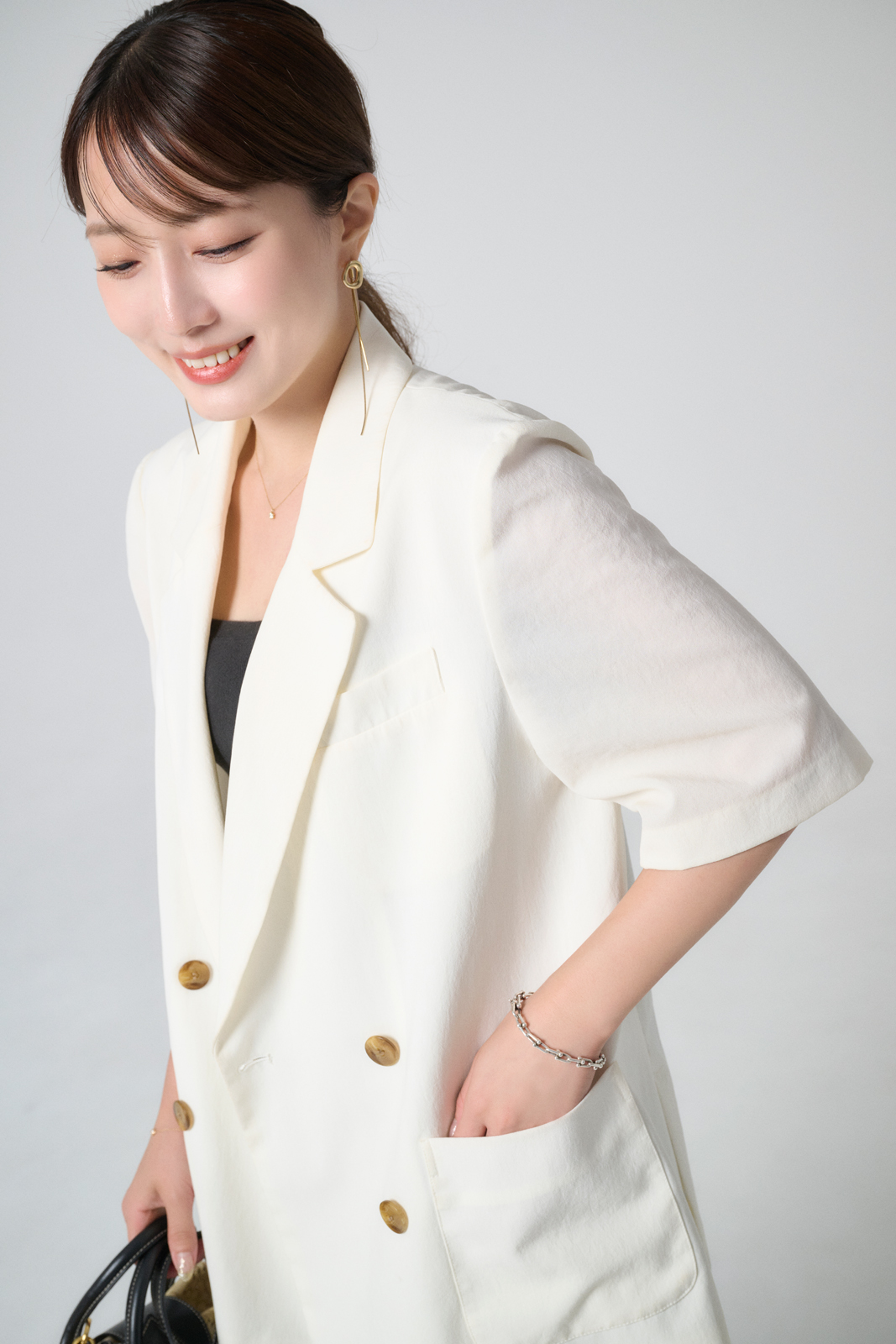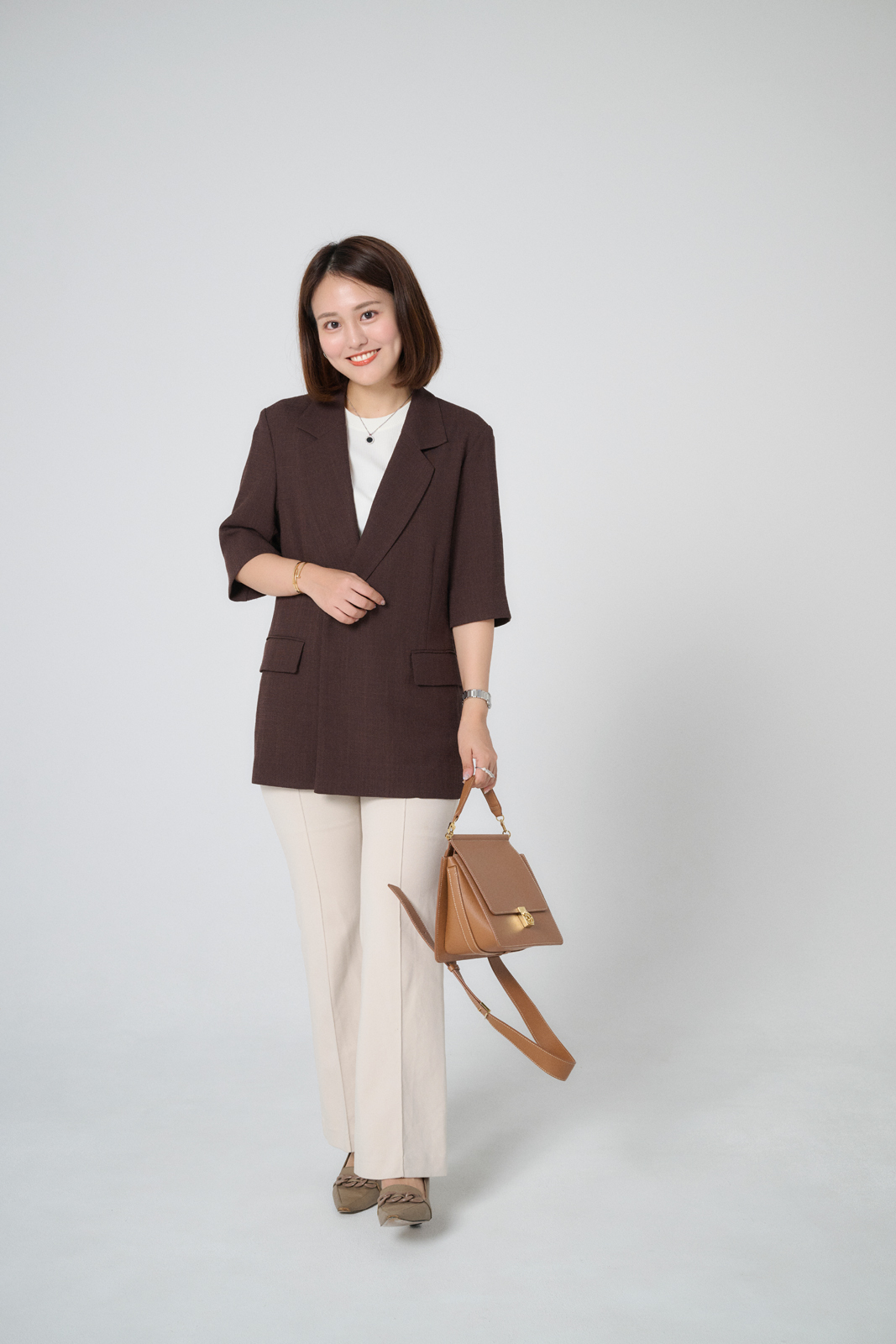 「今年初挑戦の半袖ジャケットは、暑さ対策のために購入。ブラウンはどんな色とも相性が良いですが、夏はホワイトと合わせて清涼感のあるコーディネートに。濃いめのブラウンを夏に着るのは新鮮で、黒より重くないのが魅力です。秋は同色系でまとめたオールブラウンコーデを楽しみたいです」