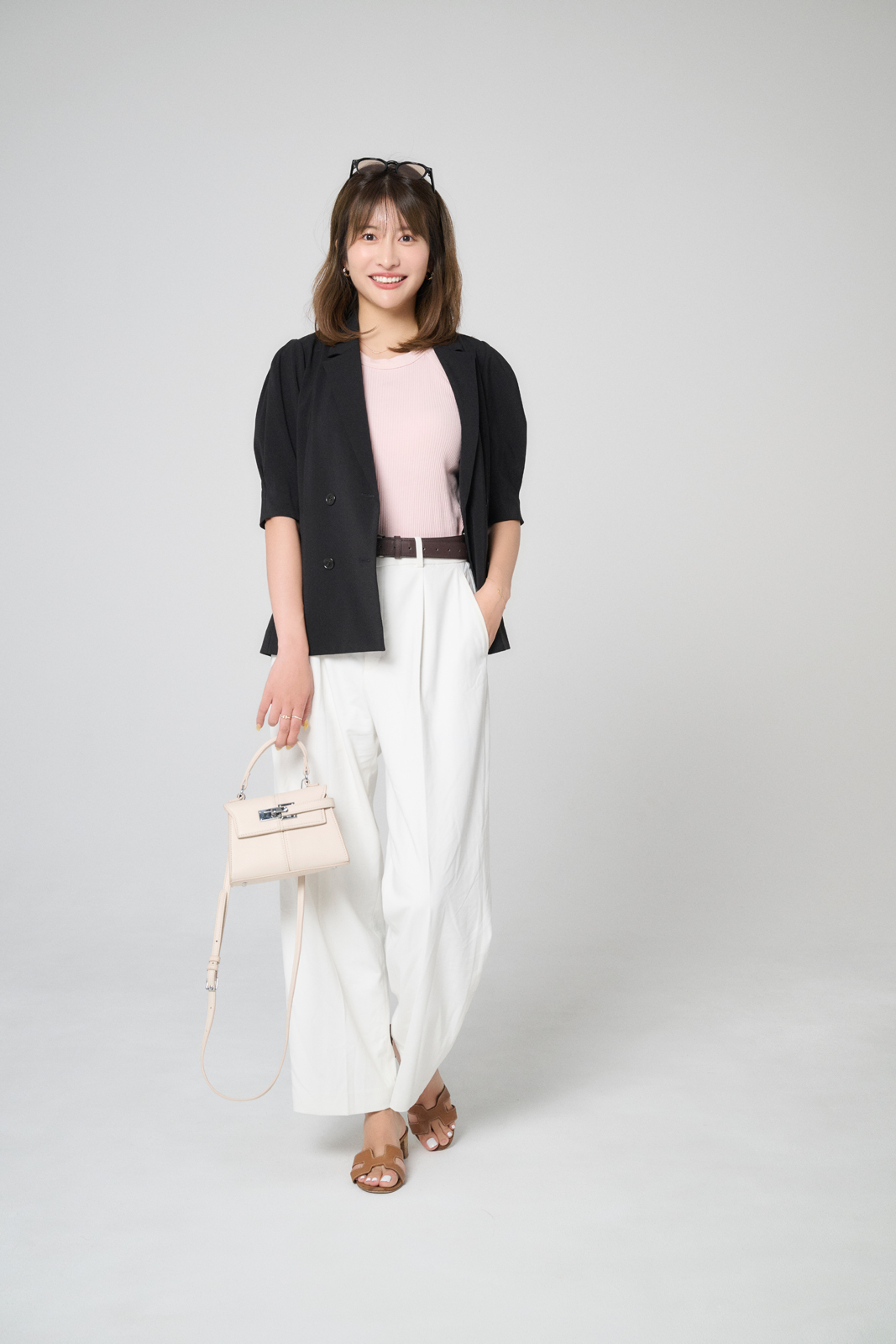 「会社の先輩とのランチを想定したコーディネート。 ジャケットを脱ぐとカジュアルになるので、お店や先輩の服装に合わせて、テンションを変えられるようにしてます! ミニバッグやサングラスなど、シーンに合わせて小物でこなれ感を足します」