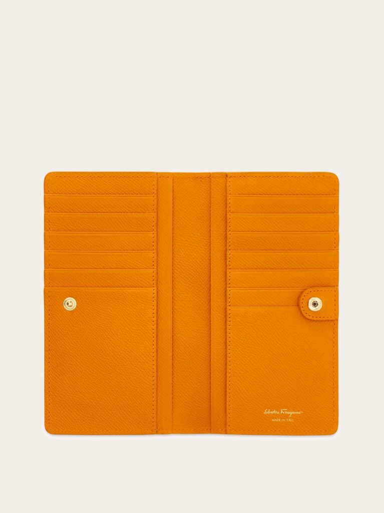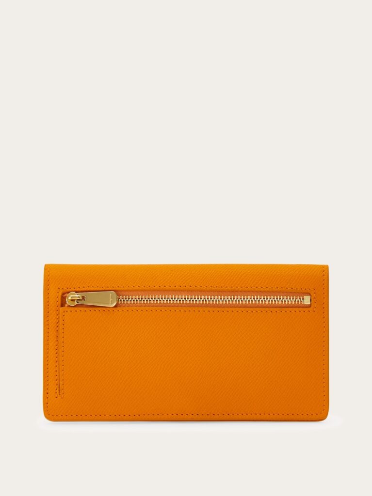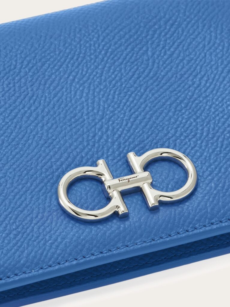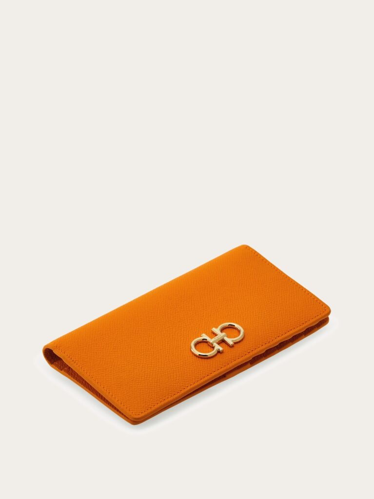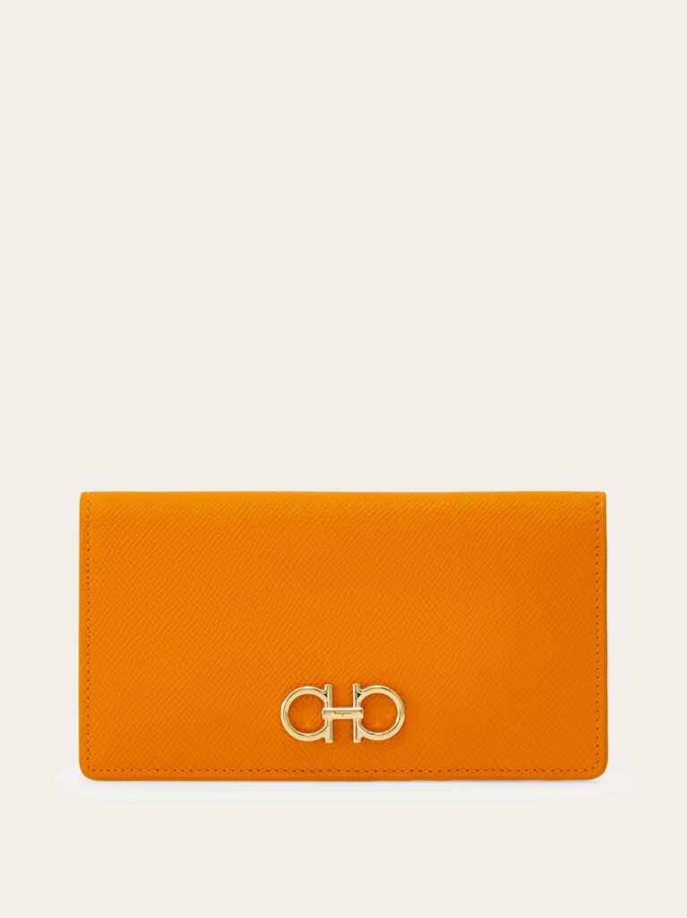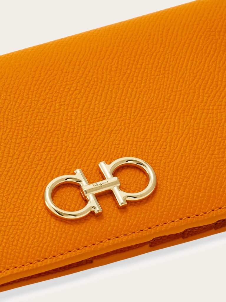 アイコニックなダブル・ガンチーニのオーナメントが印象的な二つ折りタイプのカードウォレット。13のカードスロット、4つのフリーポケット、そしてジップポケットが付いて機能的。スナップボタンクロージャー。