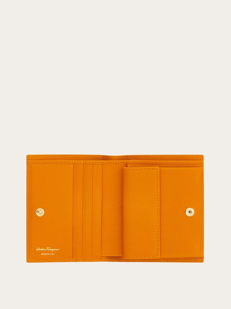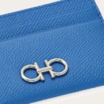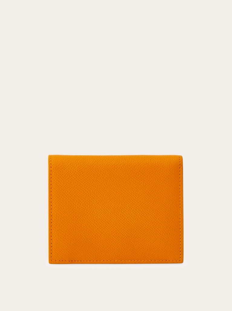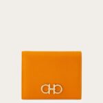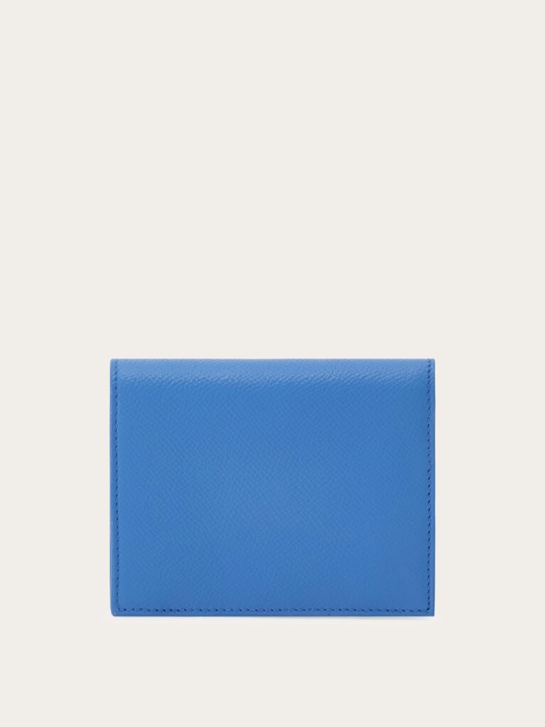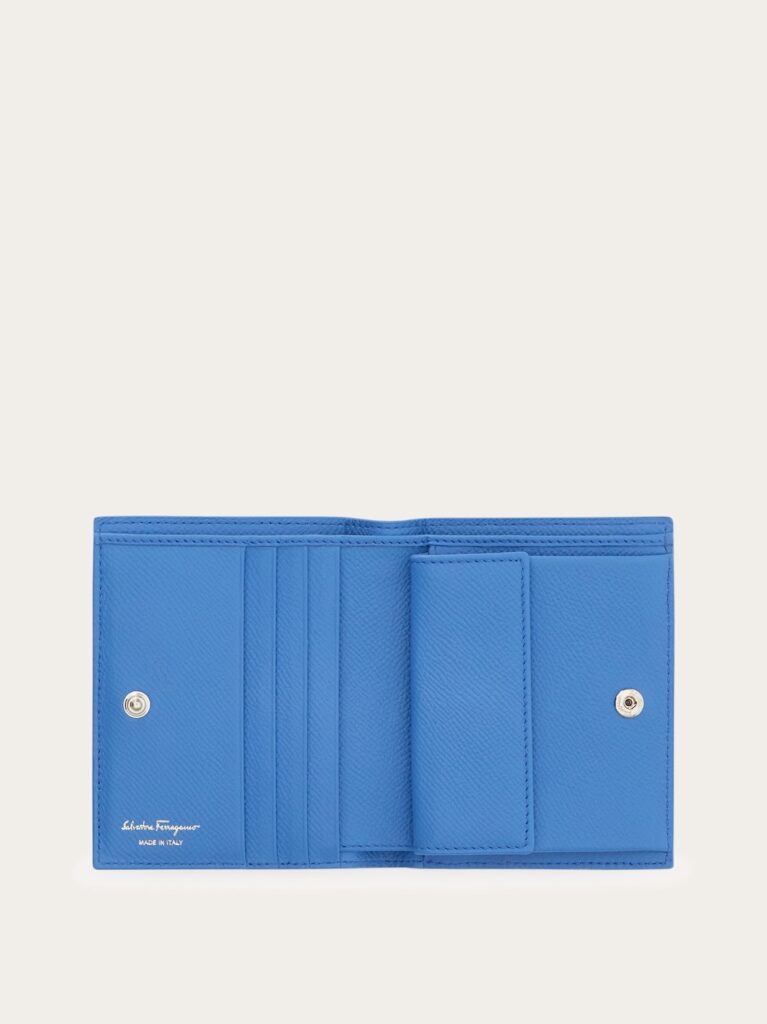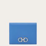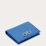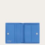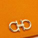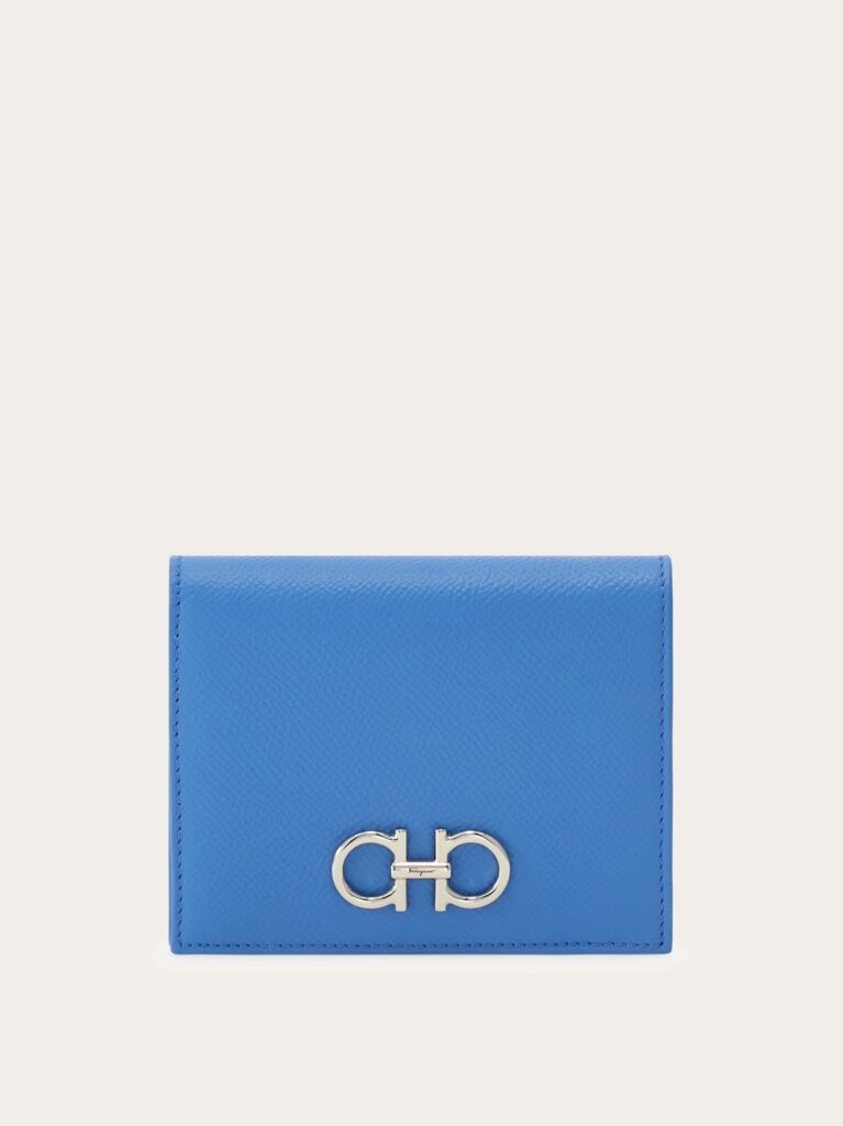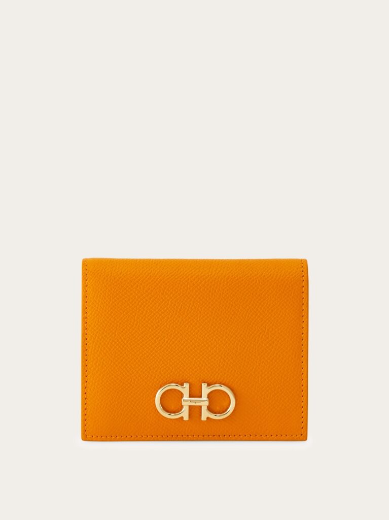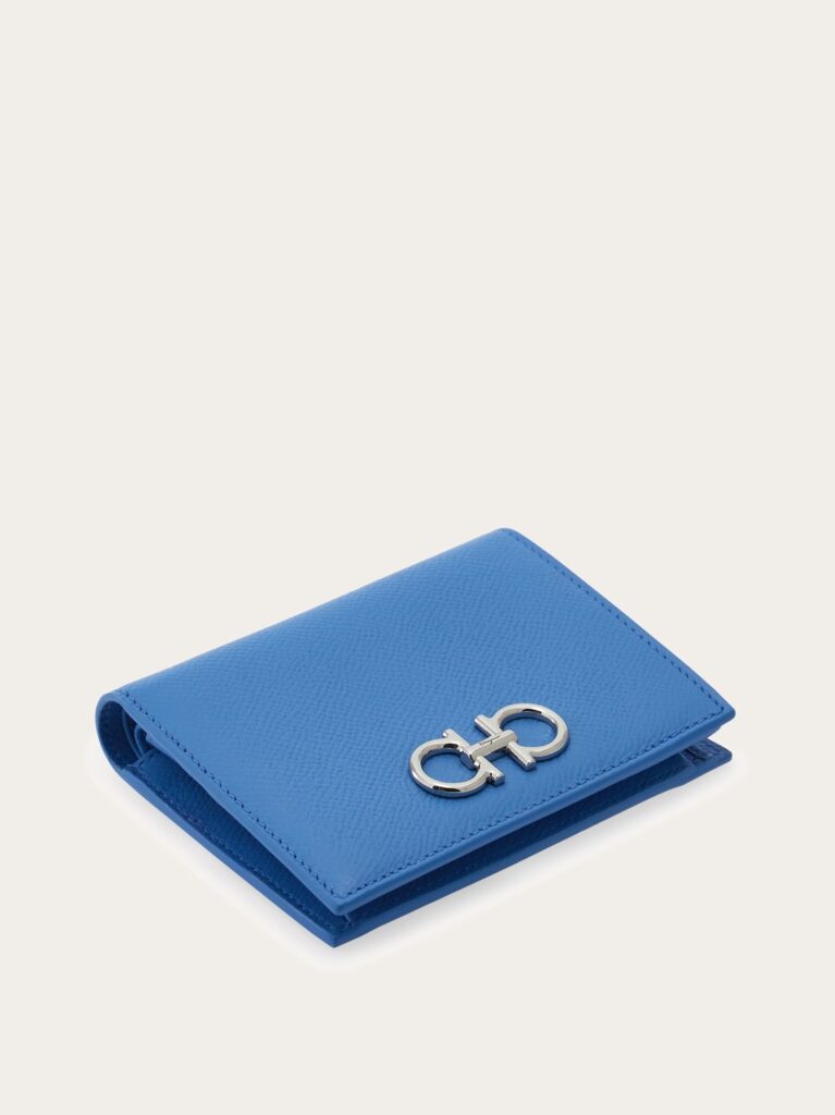 サルヴァトーレ フェラガモのアイコニックなダブル・ガンチーニが印象的な二つ折り財布。内側に4つのカードスロットと札入れ、コインケース付き。