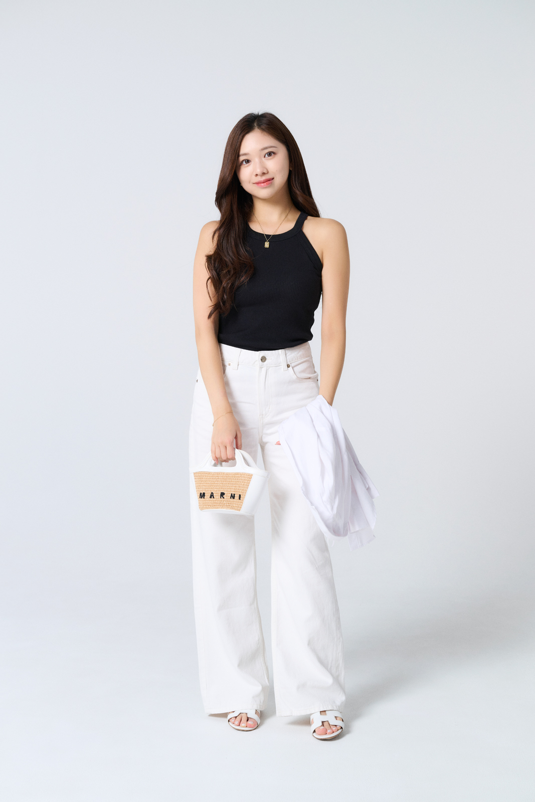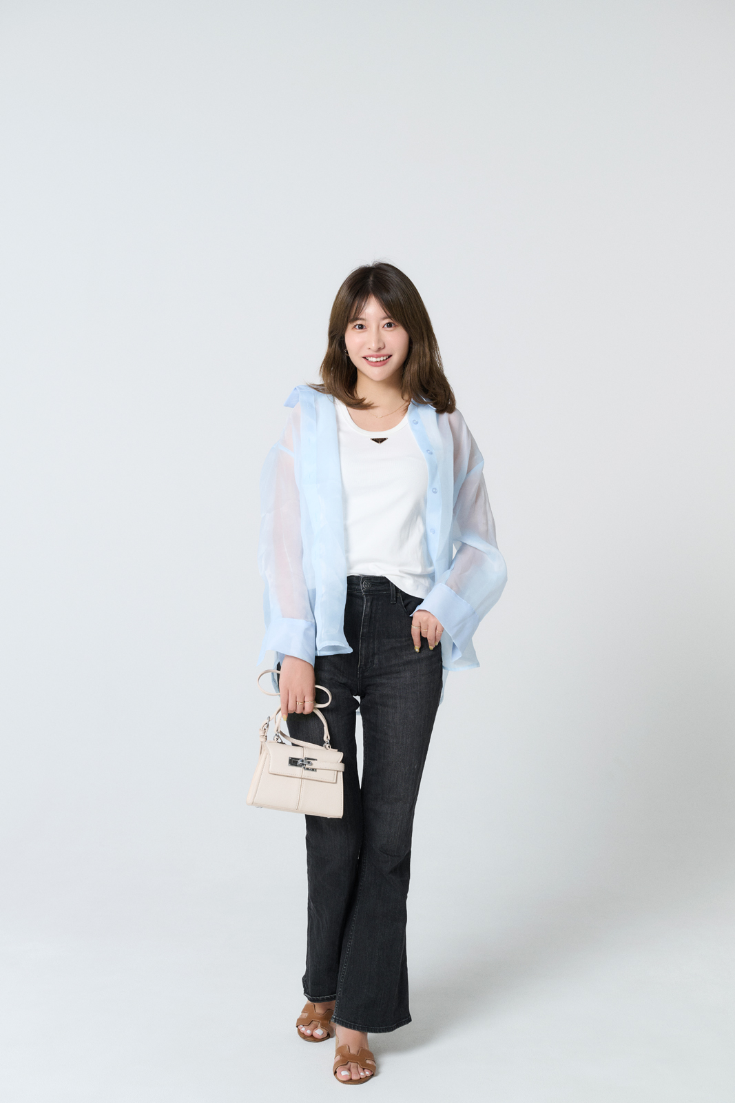 「シンプルなタンクトップコーデも海外ガール風のこなれ感を意識。カジュアルになりすぎないように、透け感のあるシャツを羽織ってほどよくきちんと感を足すのがポイントです。合わせたヤヌークのデニムは、足元がフレアになっていて脚長効果も」