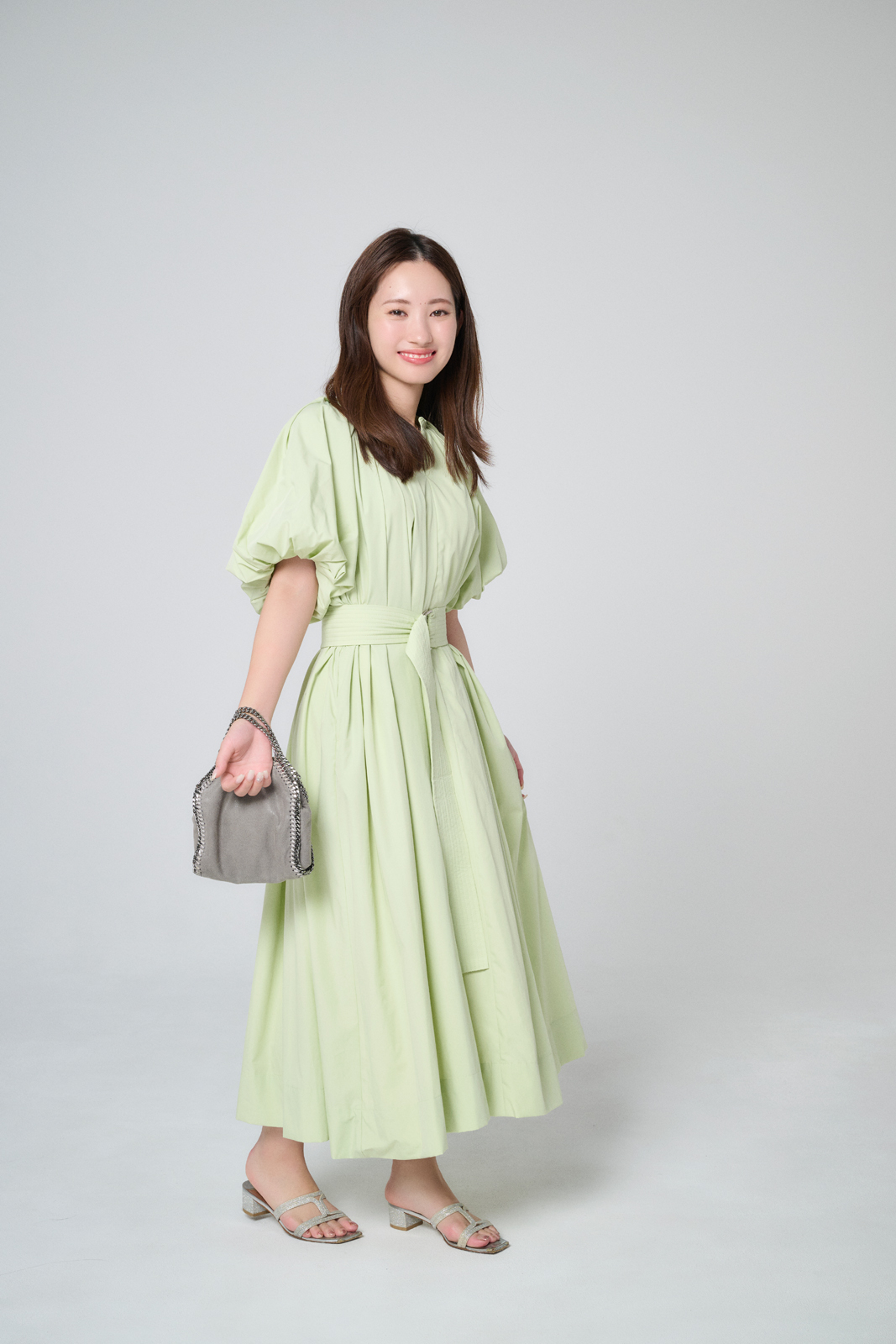 「ローブブランのワンピースは、鮮やかなパールグリーンの色味が珍しくてひと目惚れ。存在感のあるカラーなので、小物はできるだけシンプルにまとめてバランスを取ります。華やかなデザインで、動くたびに揺れるシルエットが気に入っています」