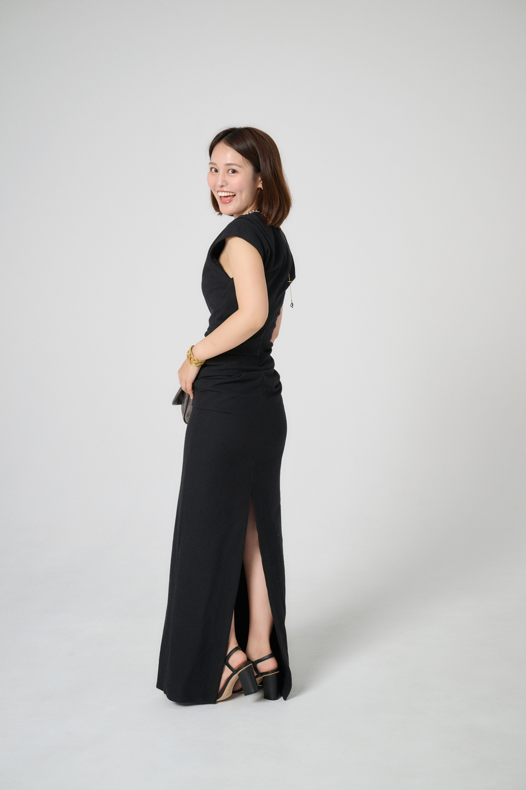 「最近黒コーデにハマっていて、気づけば黒アイテムばかり手に取ってしまいます。着るだけで顔が引き締まって見えるし、大人っぽく仕上がります。きちんと感があってオケージョンにも対応可能。友人のウエディングパーティーにも着て行く予定です」