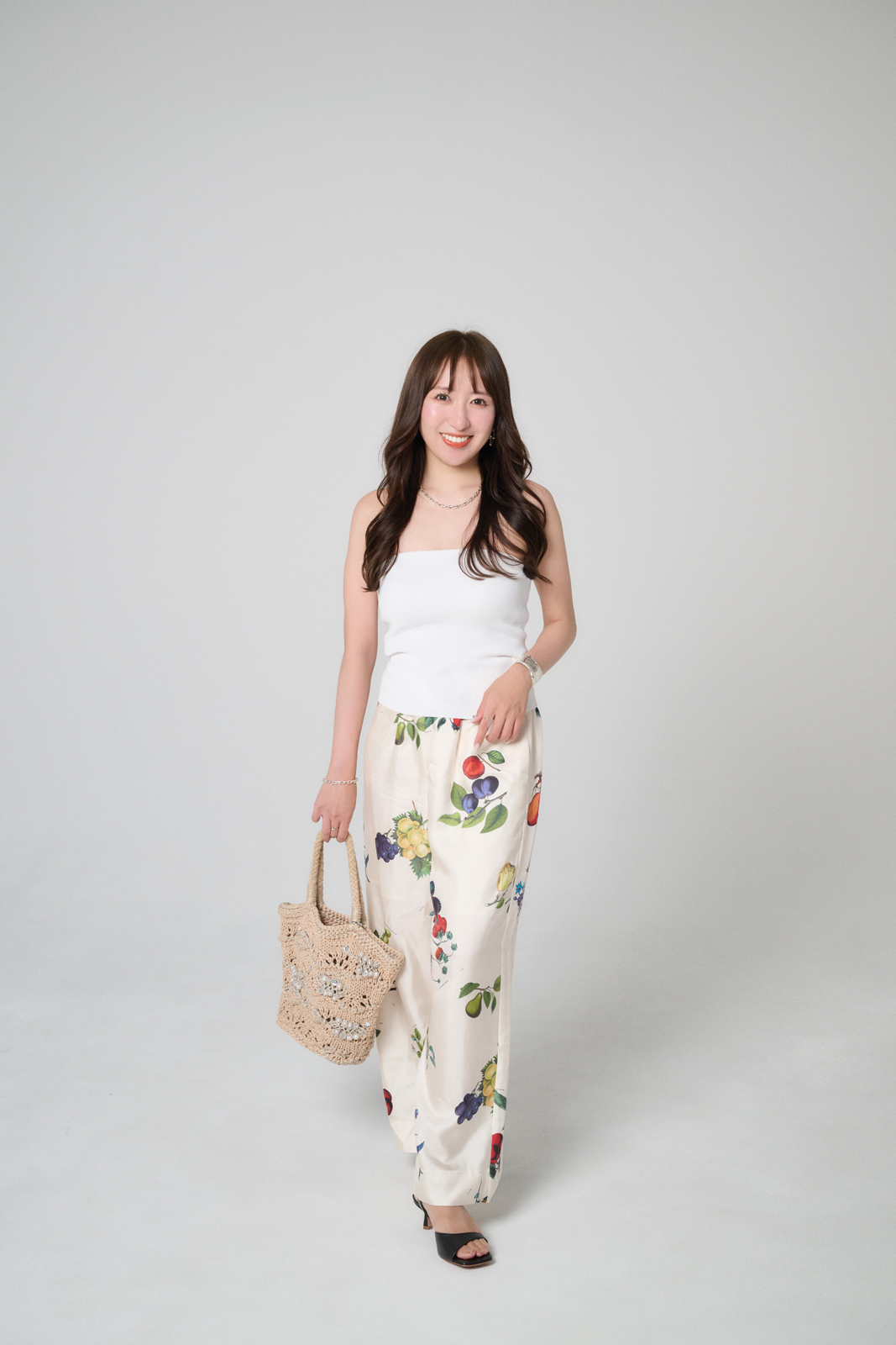 「海へドライブする日は、白コーデで爽やかに。キャバンのボタニカル柄パンツと夏らしいかごバッグを組み合わせれば、トップスはシンプルでもグッと洒落感がアップします。」