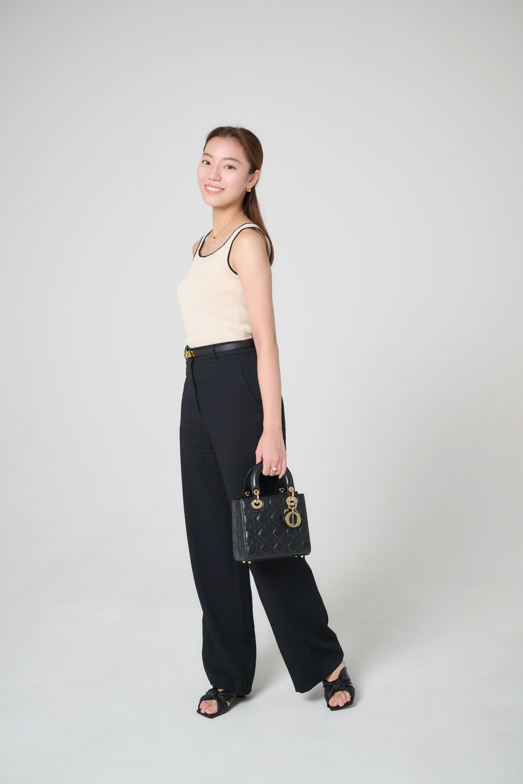 「ユナイテッドアローズのタンクは黒のパイピンクがアクセントになるのでお気に入り。ベーシックなシルエットだから1枚でもインナーとしても活躍します。スクエアネックで鎖骨がキレイに見えるのも嬉しいポイント」