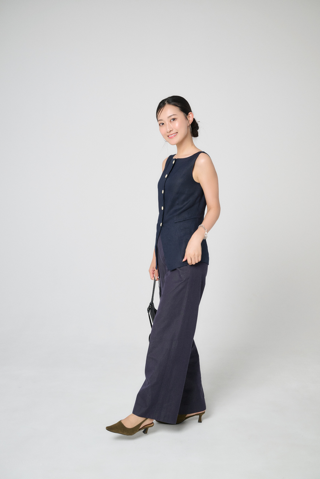 「キレイめな印象が強いネイビーコーデは、素材やシルエットでカジュアルダウンすることでこなれ感が出ます。リラクシー感のあるベストにトゥモローランドBのベルト付きパンツを合わせました。長めのベルトがアクセントになっていてお気に入りのパンツです」