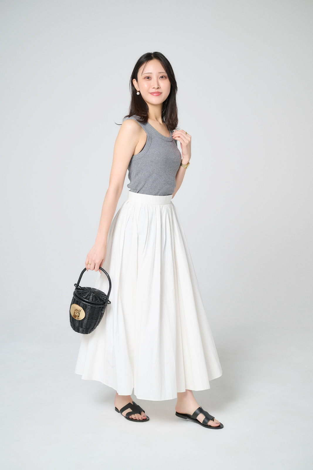 「暑い時季にヘビロテ中のユニクロのタンクトップには、バビロンの白スカートを合わせて女っぽカジュアルに。甘さを引き算するように、パトゥの黒バスケットバッグ&サンダルで引き締めました」