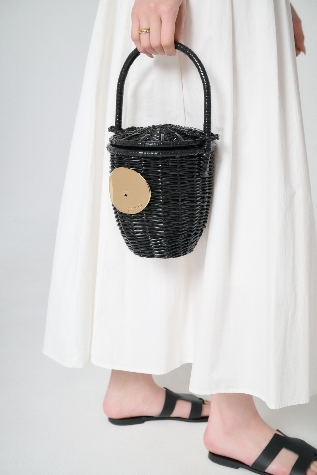 「パトゥの『ウィッカー バスケットバッグ』は、2年前のハワイ旅行で購入したお気に入り。ローマにある「真実の口」から着想を得たゴールドの装飾が、シンプルコーデのアクセントになります。光沢感のあるブラック素材だから、かごバッグでもカジュアルに転ばず、キレイめに持てます」