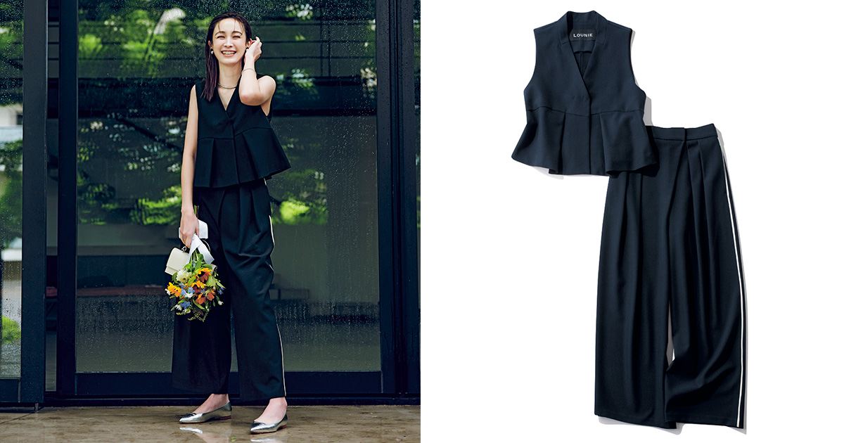 華やかなペプラム形のショートジレと脚がスラリと見えるワイドパンツのセットアップ。マシンウォッシャブルかつ、ノンアイロンで、とにかくお手入れが楽ちん。ジレは前を開けても閉じても着用可能です。ジレ¥24,200パンツ¥22,000(ともにルーニィ)