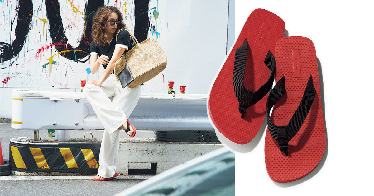 ビーサンを都会的に取り入れるなら、ラグジュアリーブランドに頼るのが手っ取り早い!注目は、この夏のビーサンブームを牽引するTHE ROWの赤ソール。遠目からでも映える一足で、夏のベーシックコーデを格上げ!