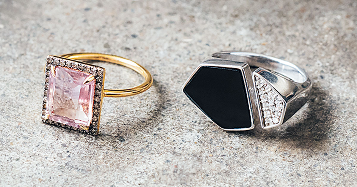 異なる2石の中にシルバープレートを配したデザイン。重厚感のある見た目に反して軽やかなつけ心地でファンの多い人気モデル。リング〈SV×オニキス×カーネリアン〉¥69,300(Hirotaka/Hirotaka 表参道ヒルズ)