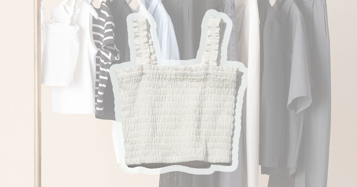 夏イベントは1枚で、ジャケットに忍ばせれば程よく抜け感が加わる旬度の高い1着。シャーリングキャミソール¥1,290〈一部店舗のみ販売〉(GU)