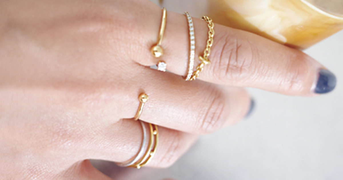 近況報告に旅行の計画、ウィッシュリストの共有……写真を見返す手元には、華奢リングを丁寧に積み上げて作った“マイオリジナル”リングがきらり。「それどこの?」と、新たな話題を運んでくれる。ルールは無用、スキンジュエリーのような繊細なデザインを思いつくままに重ねて。ふと目線を落とすたびに気分が上がる、幸せ自家発電なリングセットを。