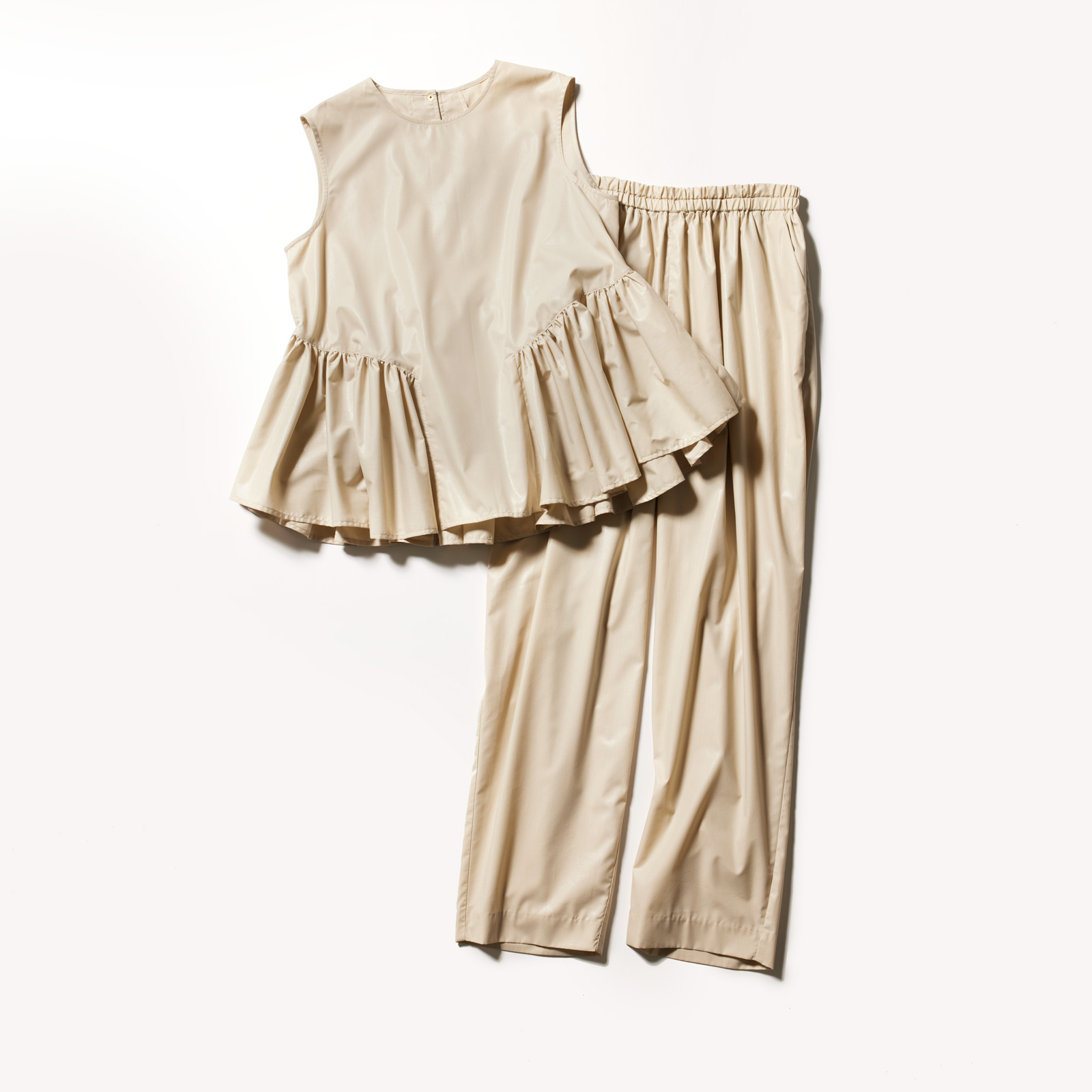 ベース素材が軽やかで清涼感があり、猛暑日でもサラッと着用しやすい1着。エッジの効いた素材感と女性らしい華やかさとシルエットのペプラムが他と被らないデザインでおすすめ。同素材のパンツも一緒に購入し、ぜひセットアップコーデを楽しんで。ブラウス¥26,400パンツ¥26,400(エレンディーク)