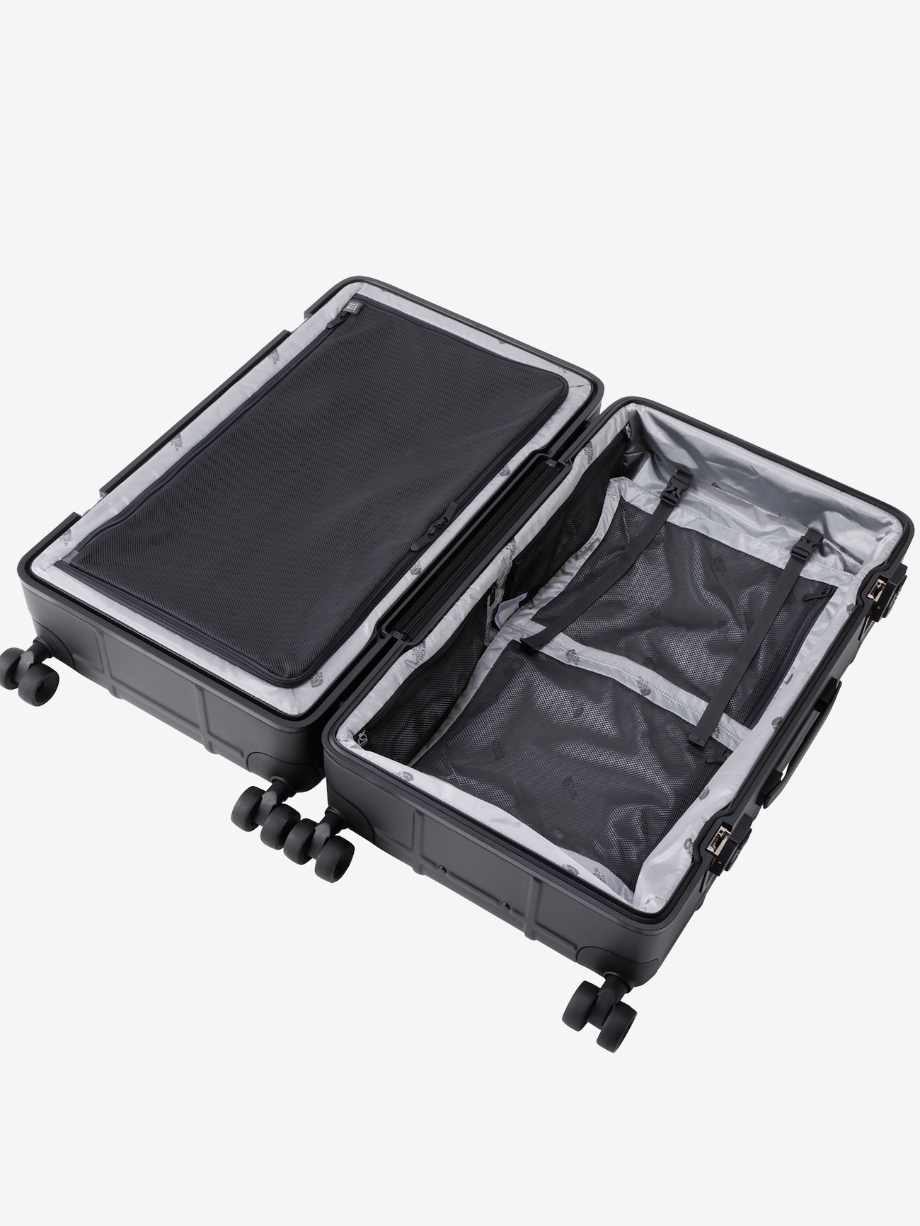 耐候性に優れたポリカーボネート素材を使用した、クラムシェルタイプのハードウィーラー。足まわりは360度回転する4軸ウィーラーで、操作性抜群。開口部にはパッキン処理を行い、防水性をアップしています。また、シャツやジャケットといった衣類の分別が楽にできる、取り外し可能なディバイダーを内部に搭載。カラーは飽きのこないシックなブラックとグレーの2色展開で、エターナルに愛用できるはず。
