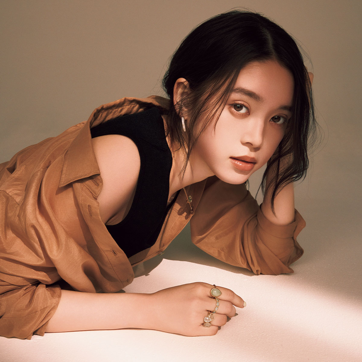 大地の色をまとうエフォートレスなジュエリーたち。ボリュームリングと繊細なブレスレットのコントラストが美しい。ピアス〈YG×ルチルクォーツ〉¥137,500(トーカティブ/トーカティブ 表参道)ブレスレット[左から]〈SV×YGP×クリアクォーツ〉¥47,300〈SV×YGP×ラブラドライト〉¥5,500〈SV×YGP×ターコイズ〉¥5,500〈SV×YGP×スモーキークォーツ〉¥5,500(すべてアルティーダ ウード)リング(中指)〈YG×オレンジムーンストーン〉¥137,500(マリハ)リング(人差し指)〈SV×YGP×シトリン〉¥123,200(ボロロ)トップス¥27,500(styling/styling/ ルミネ新宿1店)