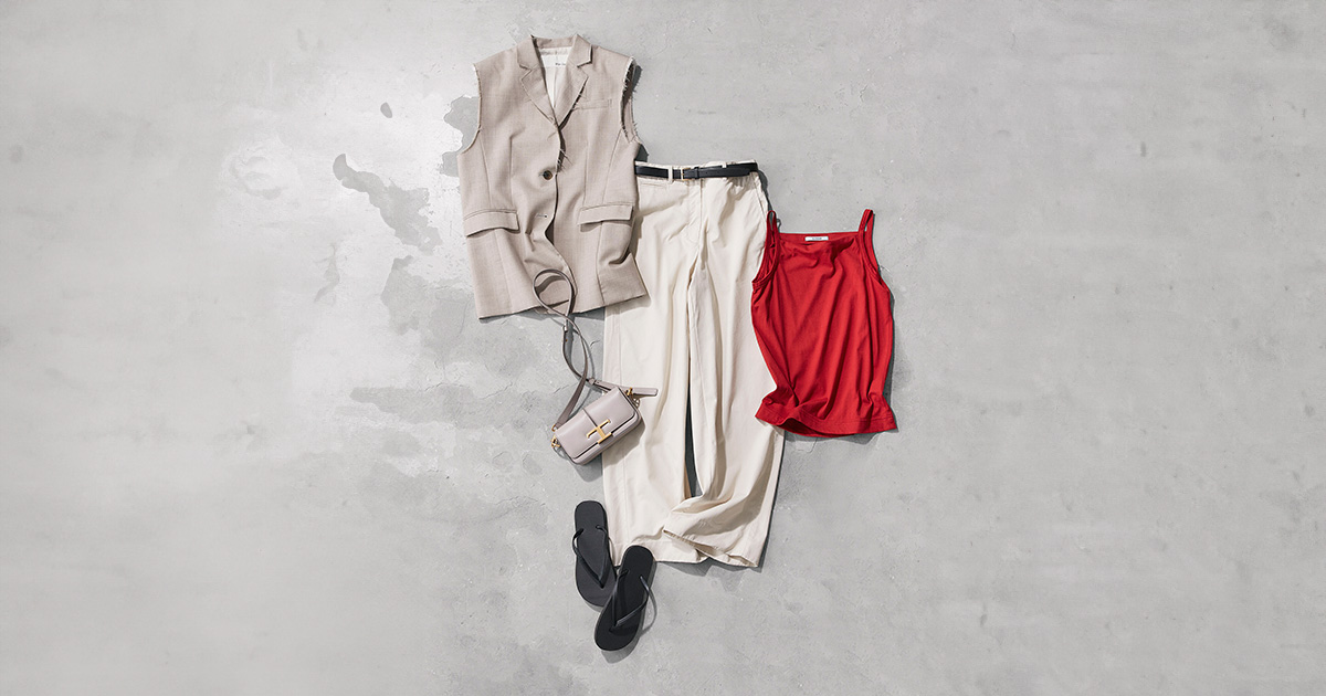 ビーサンを街履きするときは、ジレやジャケットのように真逆にあるアイテムを合わせて、ラフさを軽減。チノパンにベルトやコンパクトなスクエアバッグでトラッドな要素を加えてきちんと感も意識します。小物やアクセで締めポイントを作って崩しすぎないのもマイルール。