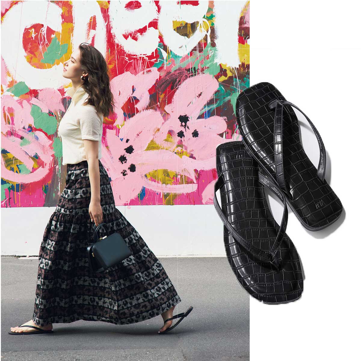 ポロニット×甘口スカートのきちんとコンビに、キレイめサンダルはトゥーマッチだし、スニーカーは暑すぎる…。そんなとき黒ビーサン。ラフなエッセンスを加えつつ、足回りをキリッと引き締める。スクエアトゥとエンボス加工で、いわゆるビーサンとは一線を画すルックス。パッド入りインソールで足当たり快適。ビーサン¥2,499ピアス¥5,499(ともにH&M/H&M カスタマーサービス)ポロニット¥19,800(マイカ アンド ディール/マイカ アンド ディール 恵比寿店)スカート¥53,900(ダブルスタンダードクロージング/フィルム)バッグ¥51,700(PUNTI./エルディスト ショールーム)