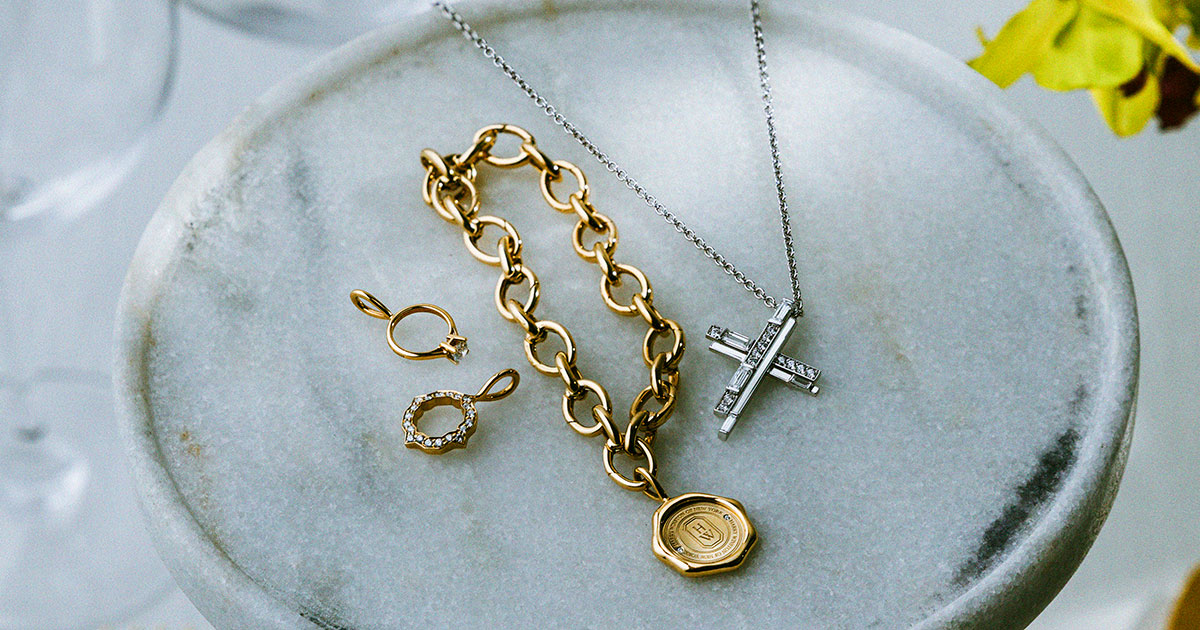 まるでふたつのクロスが重なったようなデザインのペンダントは、贅沢にも5個のバゲットカットのダイヤモンドと12個のラウンドダイヤモンドが。ジェンダーレスなデザインが、シェアにもぴったり。ペンダント「トラフィック・クロス・ペンダント」〈Pt×D〉¥2,299,000 好みのチャームを見つけて、自分用にカスタマイズできる楽しさのあるブレスレット。リンクはひとつ置きに開閉するから、サイズの違うふたりでも長さの調節は自在。「ブレスレット・チェーン」〈YG〉¥737,000「シールド チャーム」〈YG×D〉¥462,000「HWリング・チャーム」〈YG×D〉¥561,000「ベル・チャーム」〈YG×D〉¥572,000(すべてハリー・ウィンストン/ハリー・ウィンストン クライアントインフォメーション)
