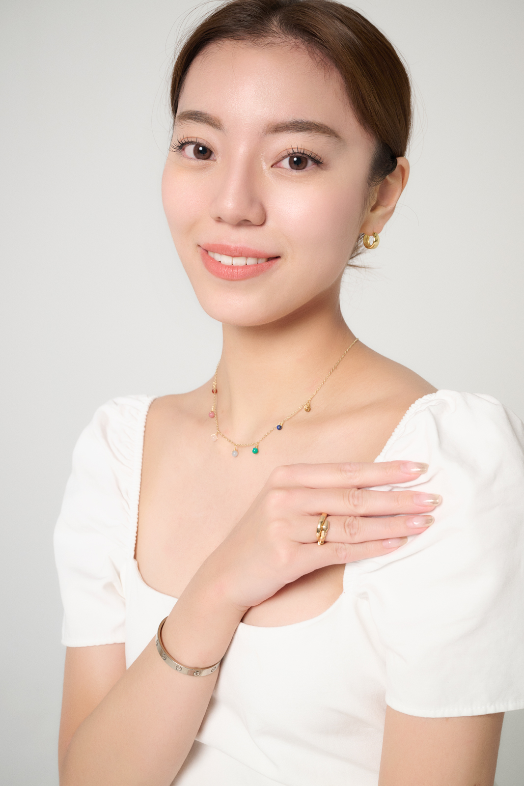 「ジュエリーは全体のバランスを意識してつけることが大事。特にネックレスとピアスはテイストを揃えるようにしています。ジュエリーが目立つように髪もアップにすることが多め。そこに、カルティエのラブブレスをプラスすることで上品さを足しました」