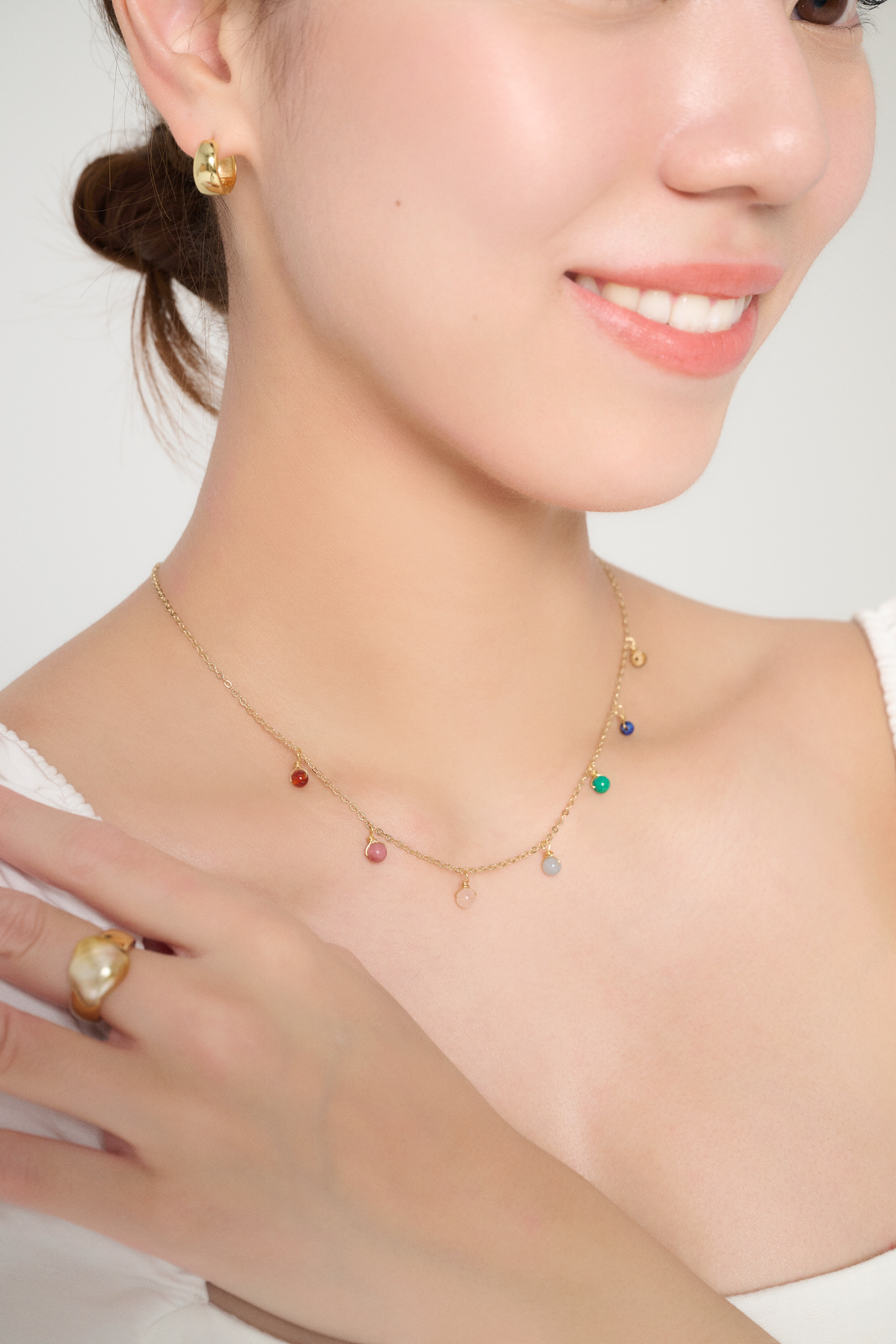 「ネックレスは友人からハワイ土産でお揃いでもらったもの。カラフルなビーズが可愛くて、デコルテが空いているトップスと合わせることが多いです。ピアスはオーストラリアのマーケットで購入したもので、旅の思い出も詰まっていてお気に入り。ブルガリのリングは家族からのプレゼントで、バングルは母からのお下がり。大切な人からもらったジュエリーは、身につけていると気分が上がります」