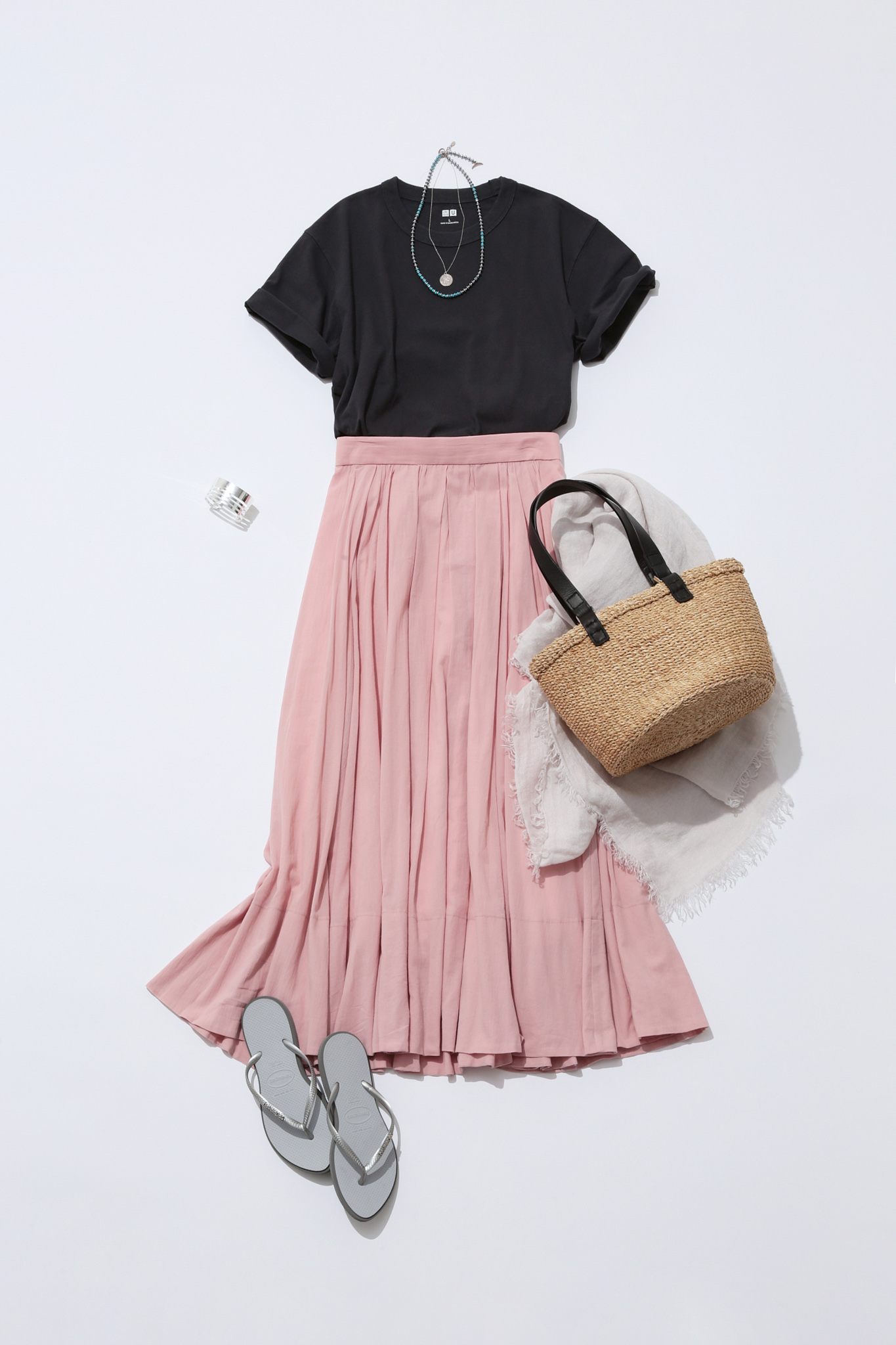 写真にも映えるフェミニンなピンクのスカートは、メンズのTシャツを合わせるとカジュアルバランス上手に。小物も色数を抑えるとより大人っぽく。海風に揺れるスカートが海デートにぴったり!