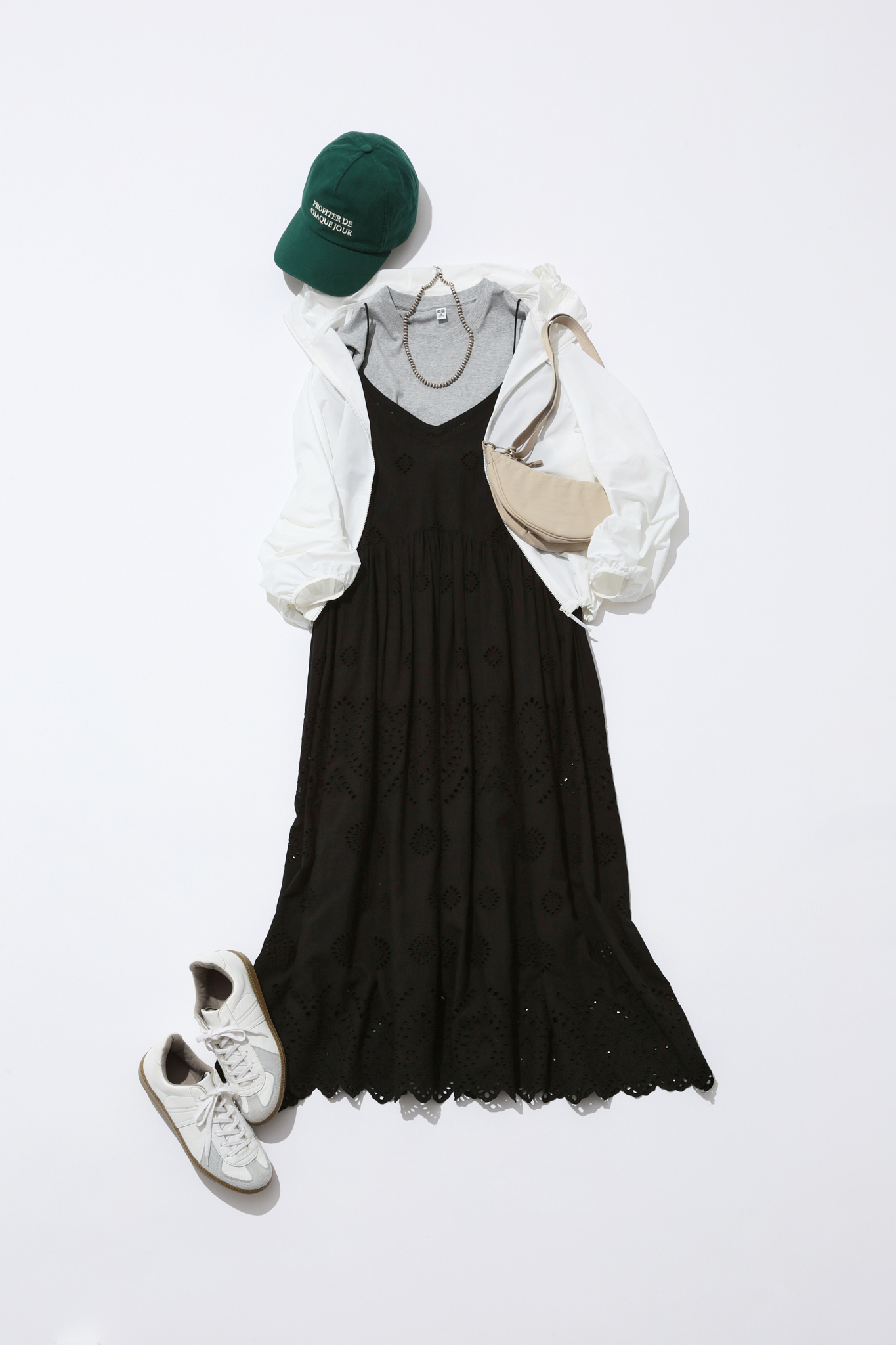 キャミワンピースを着たいけど肩周りの露出が気になる…そんな時はレイヤードでミニTを活用!インに着てももたつかないちょうどいいサイズ感です。フェミニンなワンピースにスポーティなアウターやキャップ、スニーカーを合わせて、今どきスポーティMIXコーデの完成です。