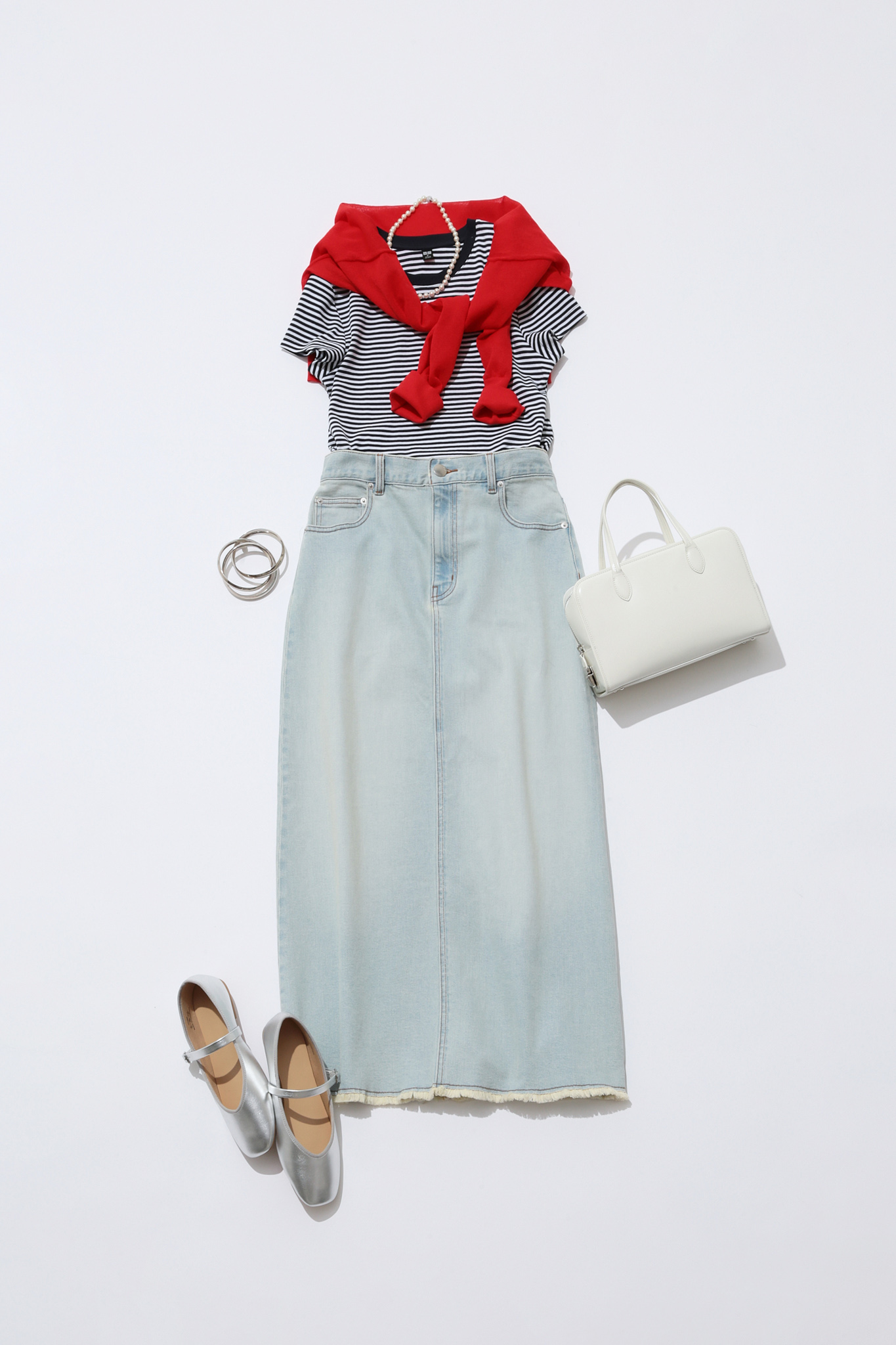 ボーダーも取り揃えている「ミニT」に、赤・白のアイテムとデニムスカートを合わせれば上品なフレンチカジュアルコーデに。シルバーのアクセサリーや靴で抜け感を出すと、より大人な仕上がりです。