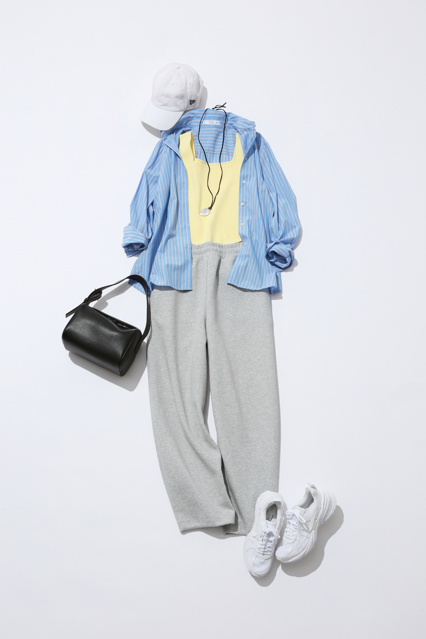 ユニクロ:シーの「スウェットワイドパンツ」はさらっとした肌触りなので、夏も快適に穿くことができます。キレイめシャツや光沢感のあるバッグなどを合わせると脱・部屋着コーデを実現!爽やかな配色がキレイ見えの秘訣。
