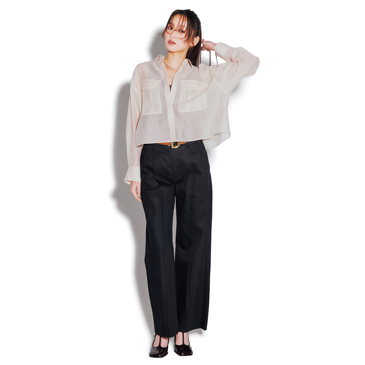 ほんのり透け感のあるライトベージュのシャツが、黒デニムのハンサムさに軽やかさをプラス。クロップド丈でウエスト位置を引き上げ、スタイルアップも自然に叶います。Tストラップのパンプスで足元にクラシカルなアクセントを効かせれば、きちんと見えと今っぽさを両立した通勤スタイルが完成。