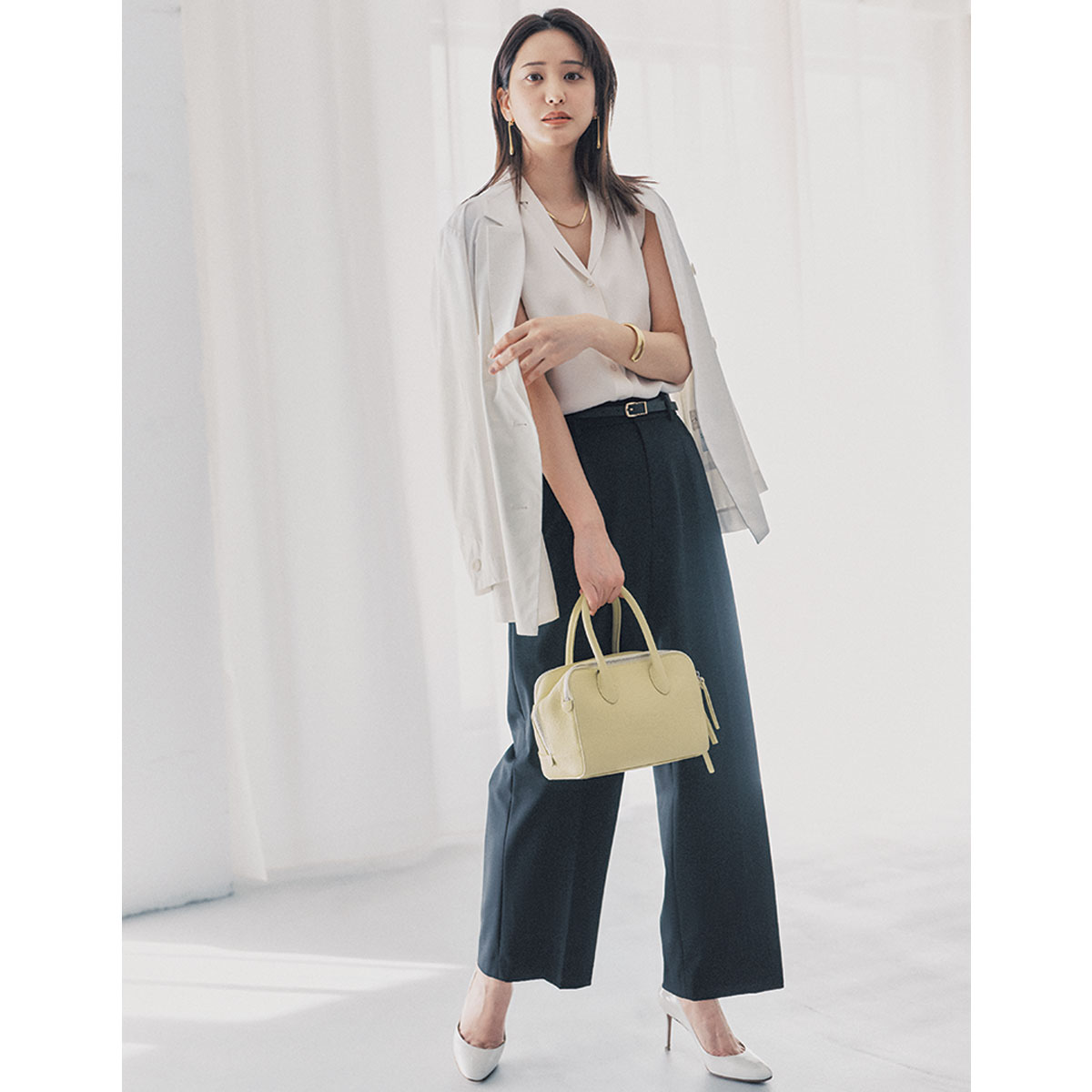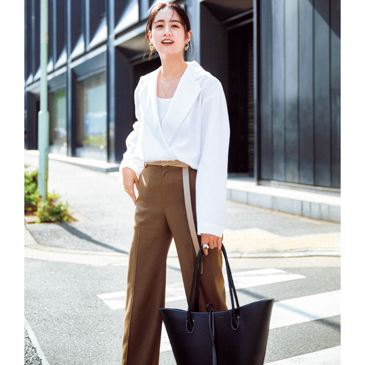 白のノースリシャツにジャケットを肩掛けして、女っぽさをふんわり演出。タックワイドパンツを合わせたシンプルなスタイルは、落ち着きと信頼感を醸し出してくれます。小物でほんのり色を差すことで、全体がほどよく華やぎ、通勤シーンに心地よくフィット。