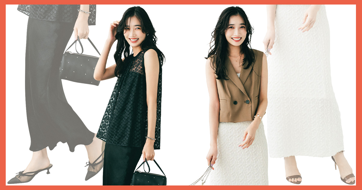 ふんわりとしたチュール素材にフリンジが施されたデザインで、Iラインながら軽やかな動きを演出。ベージュ×白の組合せで柔らかさのある大人の女性に。今年らしい短丈ジレでスタイルアップを狙って。ボタンを留めてトップス使いするのもポイント。スカート¥6,930(Lumier)ジレ¥7,150(オペーク ドット クリップ)バッグ¥44,330(minit mute/HANASHOWROOM)サンダル¥30,800(ツル バイ マリコ オイカワ)ネックレス¥30,800ペンダント¥85,800(ともにマリハ)ブレスレット¥16,500(フォークバイエヌ/UTS PR)