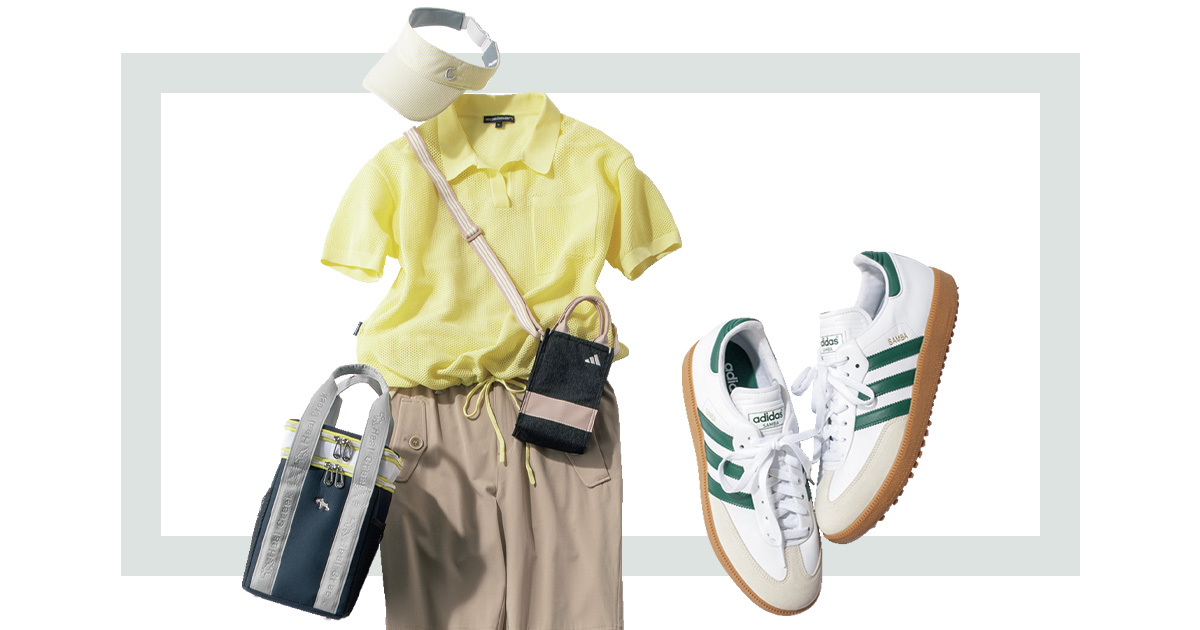 トレンド感満載の透けニットポロ×ワイドパンツで作る、トラッドなスポーティスタイルが新鮮。保冷バッグ持参で、暑い観戦を涼しく乗り切るのが賢明です。ゴルフシューズ¥19,800(アディダス ゴルフ/アディダス ゴルフお客様窓口)※参考価格メッシュポロ¥18,700〈ロサーセン〉パンツ¥38,500保冷バッグ¥14,300〈ともにヒール クリーク〉(すべてグリップインターナショナル)サンバイザー¥6,600〈キャロウェイ レッドレーベル〉ソックス¥1,650〈キャロウェイ〉(ともにキャロウェイゴルフ お客様ダイヤル)ポシェット¥4,950(アディダス ゴルフ/アディダス ゴルフお客様窓口)
