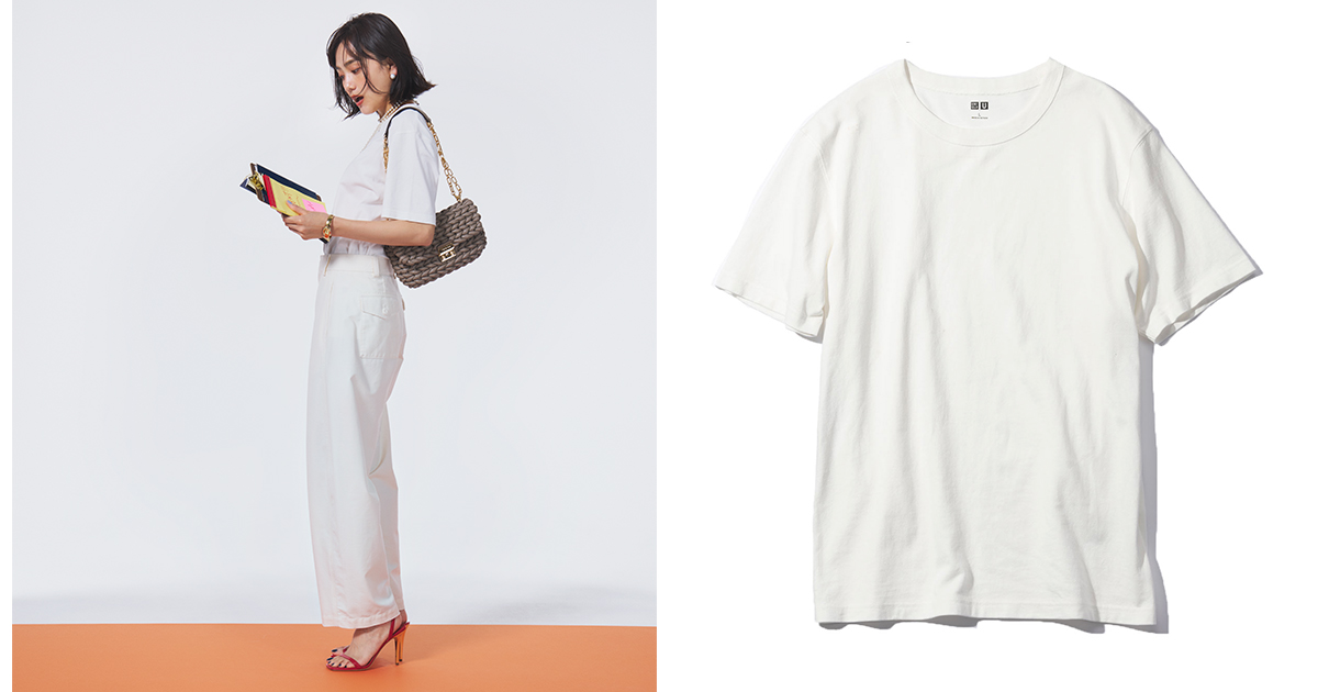 シンプルな白Tは、体が泳ぐサイズ感が◎。ほんのりハリのある素材で通勤にもしっくり。メンズTシャツ¥1,500(Uniqlo U/UNIQLO)